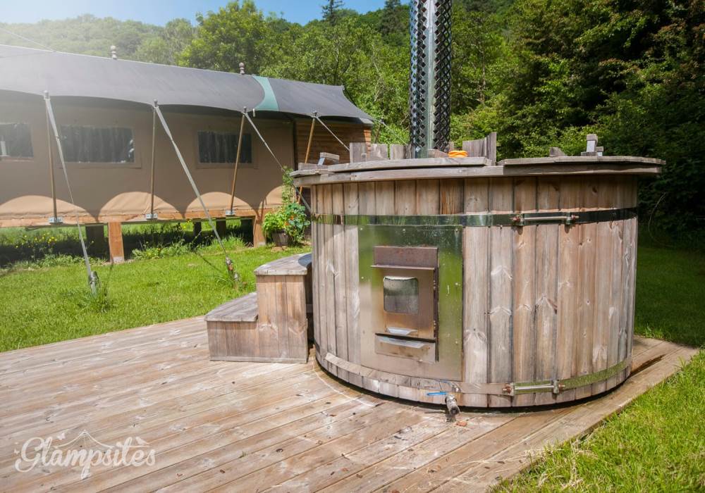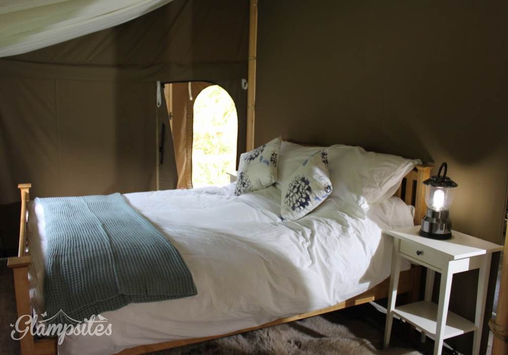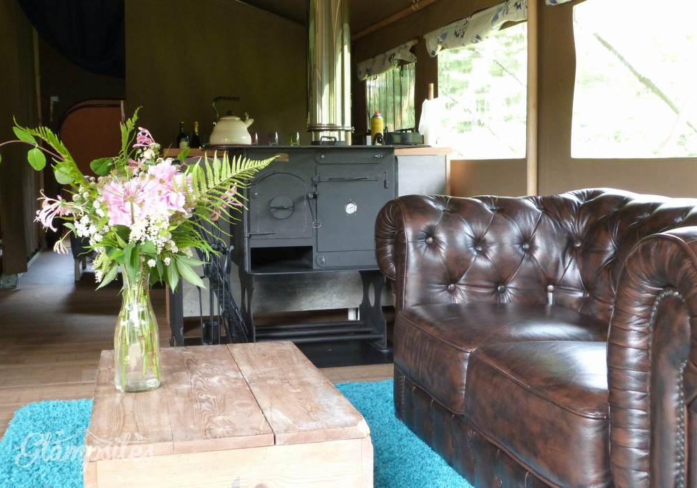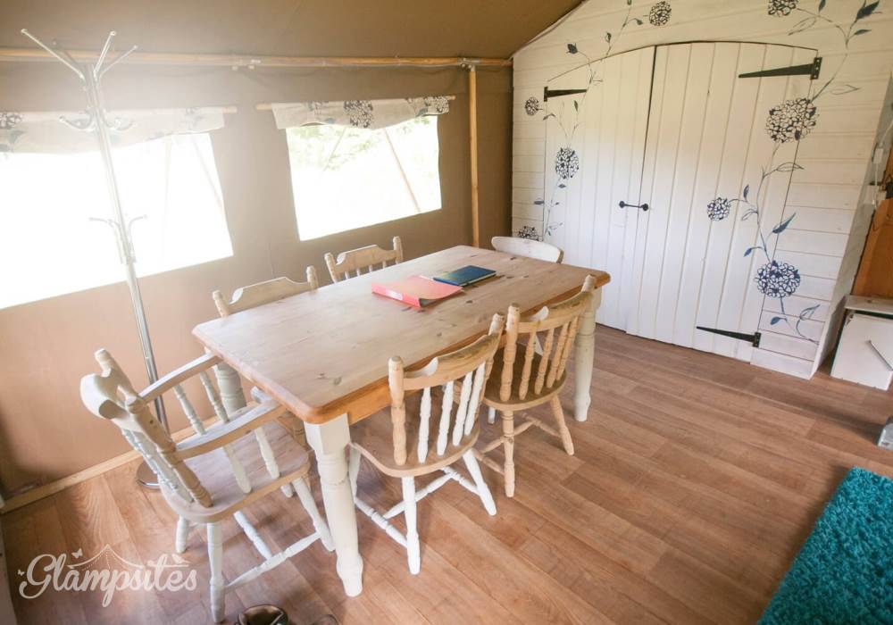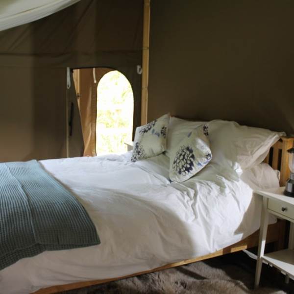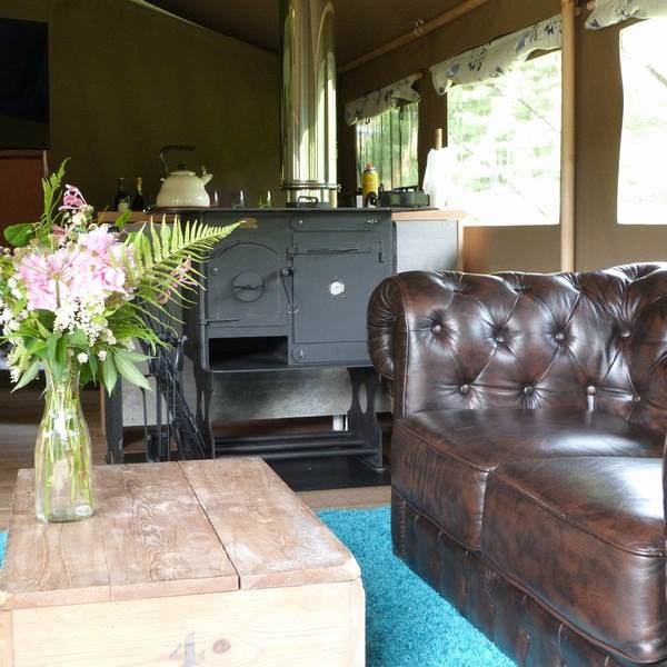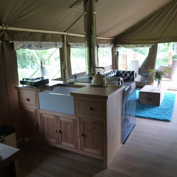 Teifi, one of our luxury safari tents features stylish open plan living for up to six people. This includes a fully equipped kitchen area with ample space to prepare and cook meals and a traditionally styled wood burning oven which can also be used a stove in the evenings, keeping you warm and cosy. A range of condiments, cooking oils and little extras like tin foil and cling film are all included. The fire is all set up for you on arrival and a supply of wood and everything that you need is included in our stay. The lounge area has a comfortable sofa to relax on and bean bags, There is a dining table, which seats 6, for meal times. There is a shower room and separate wash basin and toilet. Towels are included and a range of luxury toiletries to get you started.