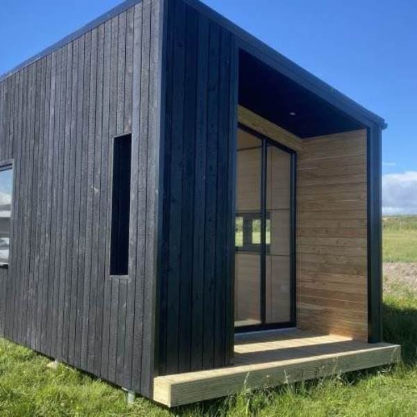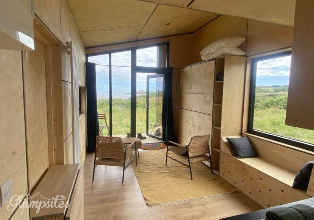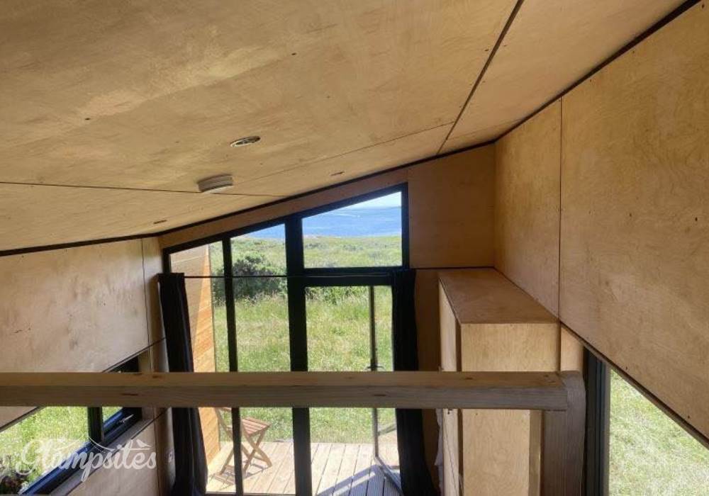 The cabin sleeps four, kids will love sleeping on the mezzanine over the kitchen and bathroom. The cabin features a daytime and night time configuration with a fold-down double bed built into a storage wall. With a Birch Ply storage wall it's warm, and light-filled, has a well-equipped kitchen with an induction hob, oven and fridge.