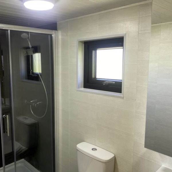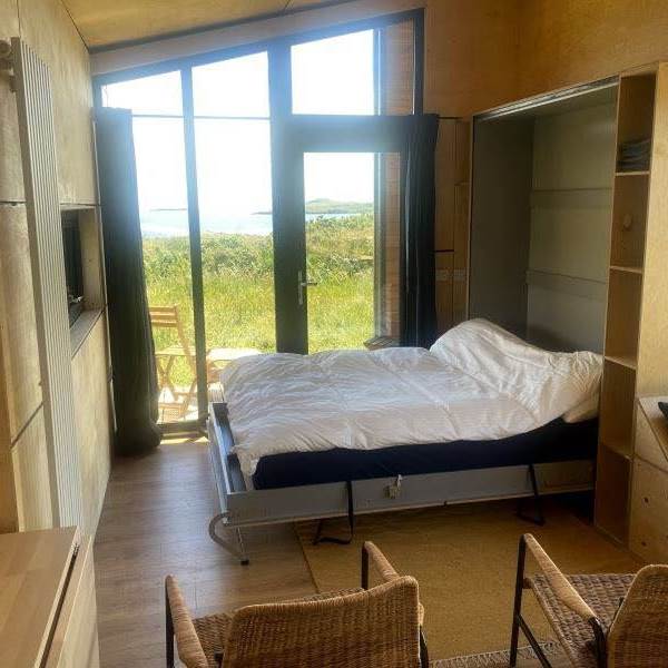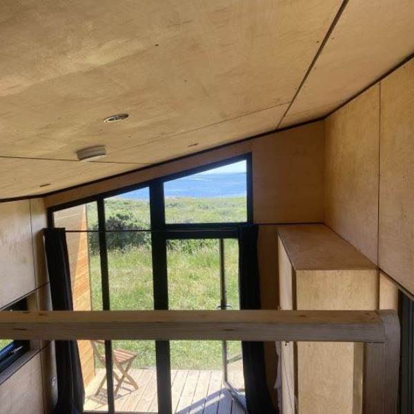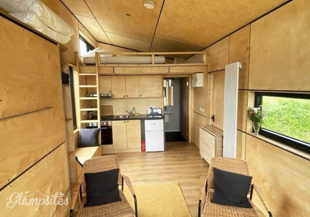 The cabin sleeps four, kids will love sleeping on the mezzanine over the kitchen and bathroom. The cabin features a daytime and night time configuration with a fold-down double bed built into a storage wall. With a Birch Ply storage wall it's warm, and light-filled, has a well-equipped kitchen with an induction hob, oven and fridge.