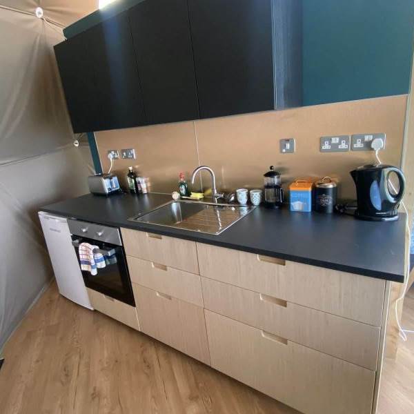 It sleeps four, with a skylight to view the stars, it is furnished with stylish, high-quality, Scandinavian-style furniture and a compact kitchen with an induction hob, and fridge. It has a shower and as it is within our Special Area of Conservation a dry toilet. The campsite toilets and shower are about 100m away.