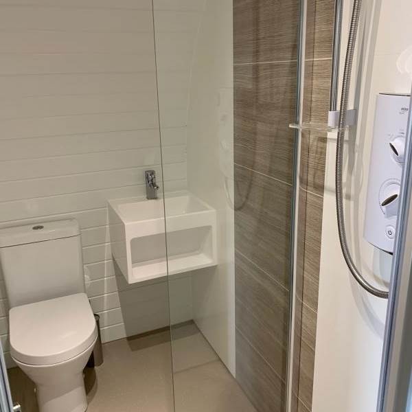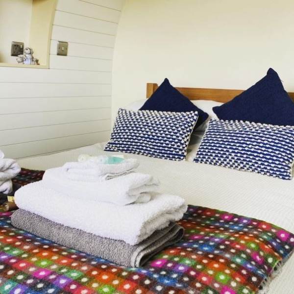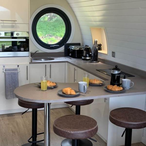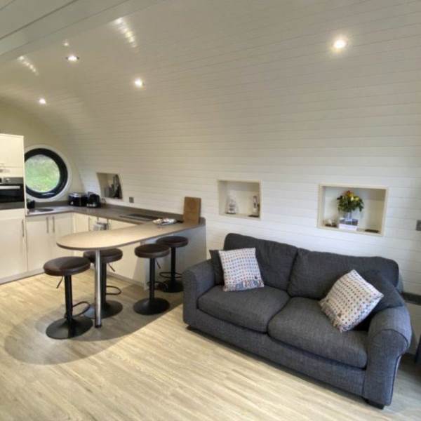 The en-suite shower room has complimentary toiletries, towels, a sink and hot running water. The pods are fully insulated and have central heating as well as WiFi, multiple charging points and a smart TV.