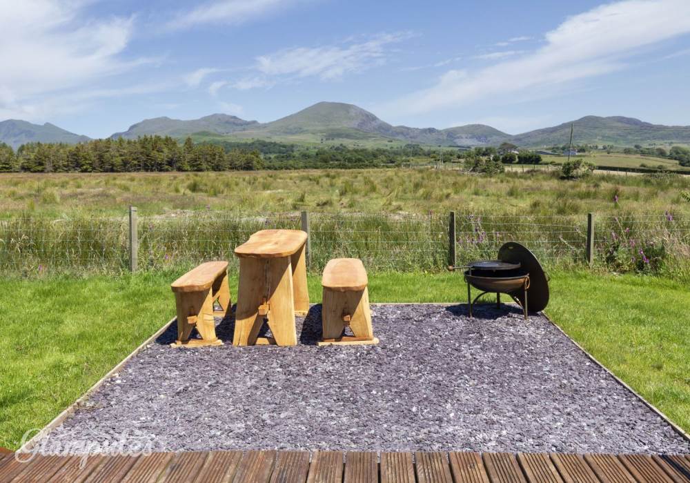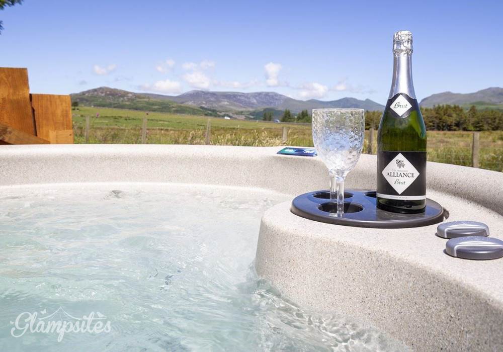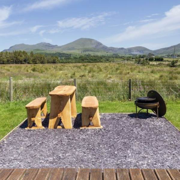 The Moel Hebog glamping pod has its own stunning hot tub and is located in a quiet tree lined corner of the farm which enjoys stunning views of the Snowdonia mountains and the Cambrian coast.