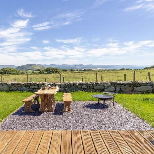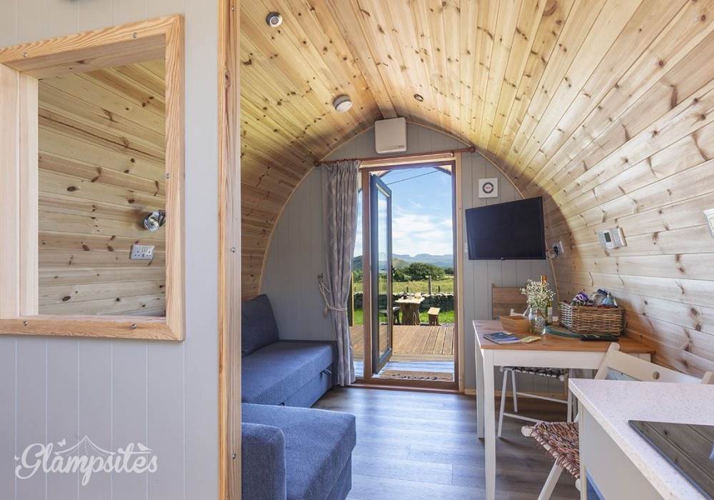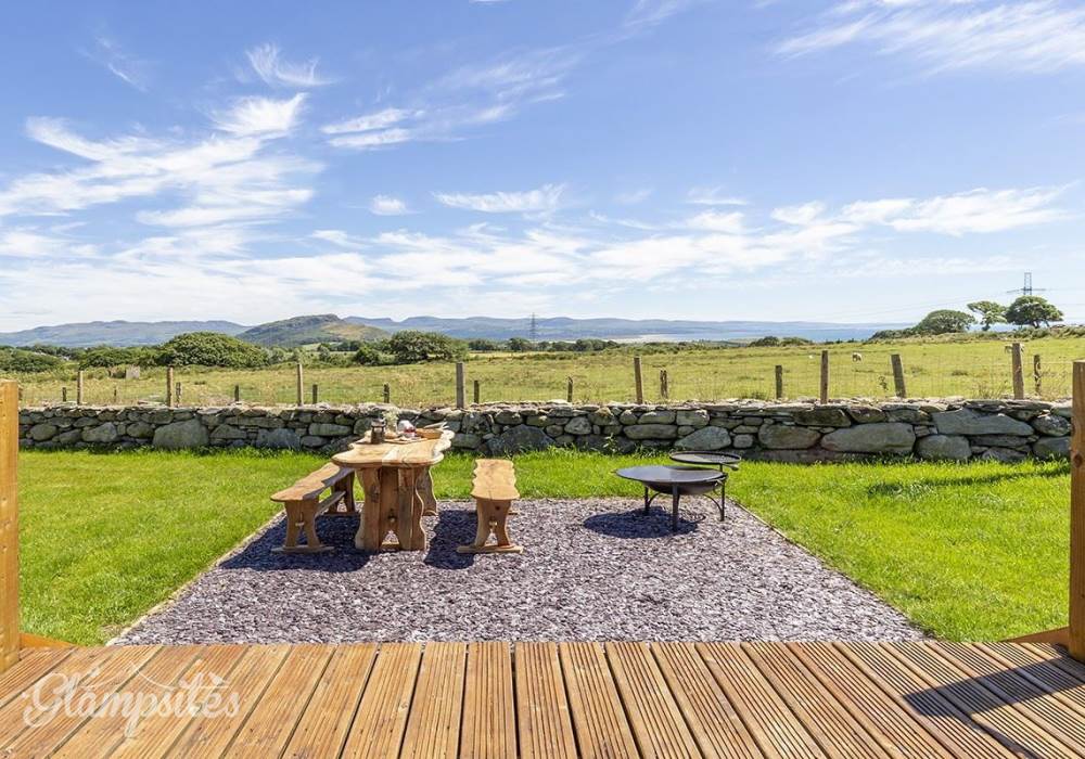 The Moel y Gest glamping pod is pet-friendly and is located in a quiet tree lined corner of the farm which enjoys stunning views of the Snowdonia mountains and the Cambrian coast.
