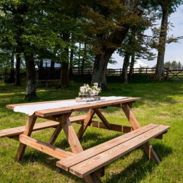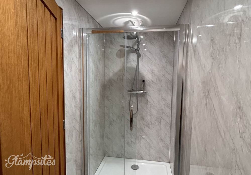 As you arrive at our bell tent site, you'll be captivated by the serene beauty that surrounds you. Set in a peaceful natural setting, the facilities provide a seamless blend of rustic charm and modern amenities with a kitchenette equipped with a microwave, kettle and mini fridge, and a large modern power shower.