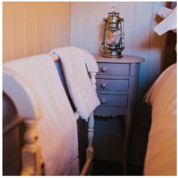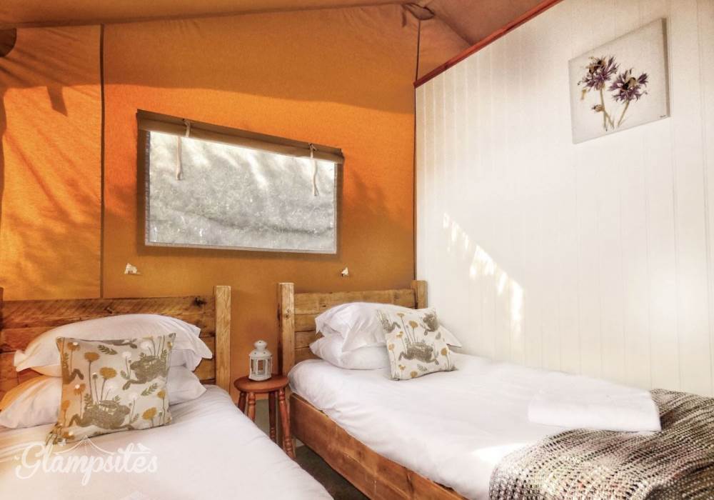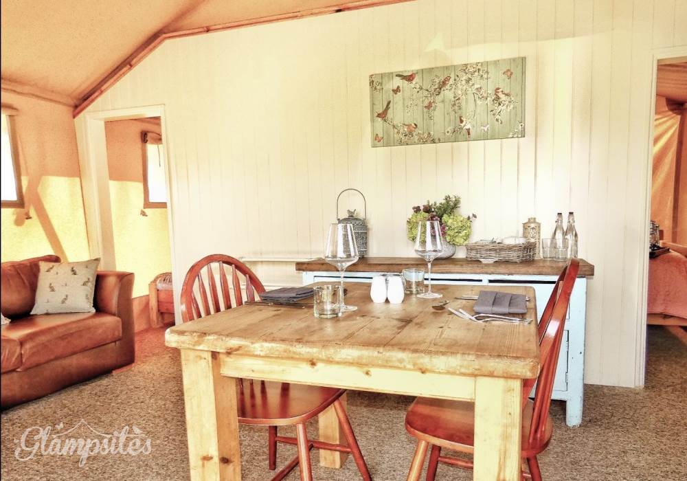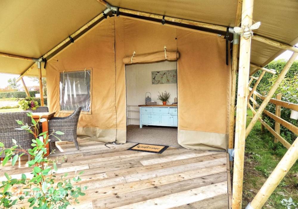 Bumble Bee Cottage boasts two beautifully-appointed bedrooms, a double and a twin each with thermostatic heating and windows (with covers). The oak-framed bedsteads are full-size in each bedroom and all have extra deep mattresses resplendent with very snuggly duvets, quality linen and super puffy pillows. The lounge/diner leads out to the raised deck, which has been formed from reclaimed blonde floor-boarding and commands very picturesque views across the surrounding rolling countryside-background noise is provided by the wildlife! The tent is laid to carpet throughout providing a reassuringly cosy feel underfoot-not what you’d normally expect under canvas!
