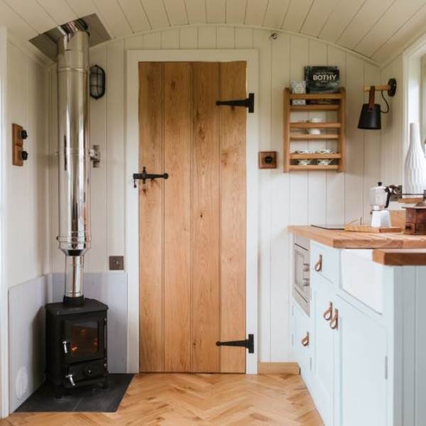 The Martha hut is 18 feet long and contains a double bed, kitchen area (electric hob, fridge and small belfast sink), seating and a bathroom with hot water shower and flushing toilet.