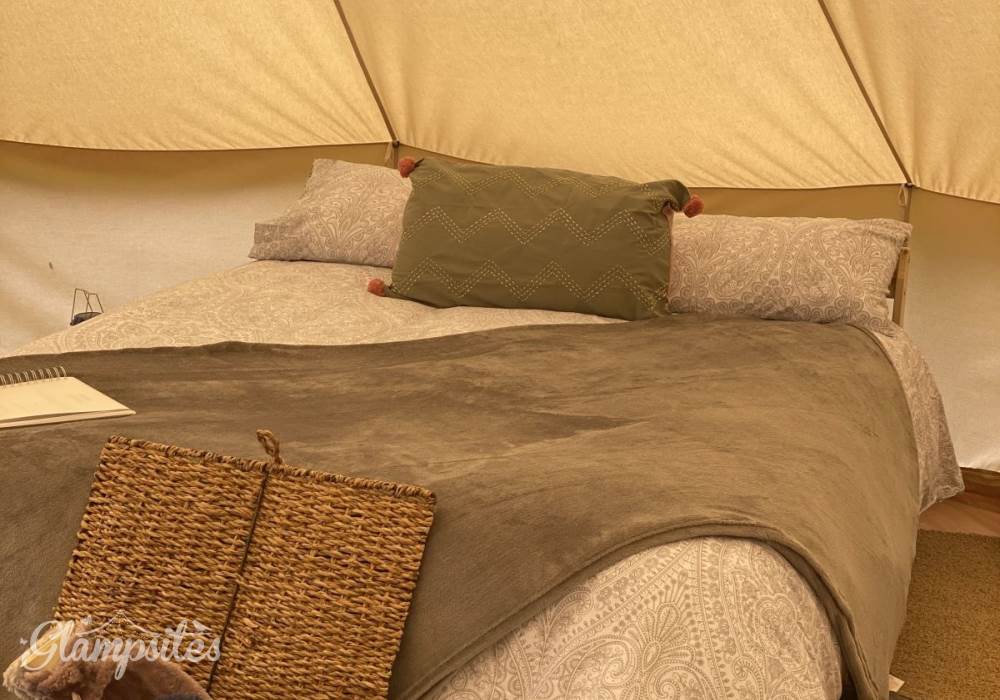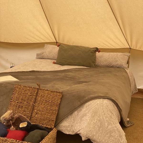 Our Bell Tent offers spacious accommodation which we hope everyone will love ! There is a double bed complete with Duvet and Hot water bottles if you feel a little chilly. we also offer additional air beds and bedding for up to 4 more people, (either doubles or singles).