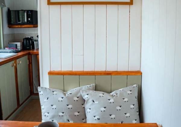 Inside there's a gas cooker, crockery, cutlery, pots and pans, sink with running water, heater, electricity supply and log burner to keep you cosy through the cold nights.