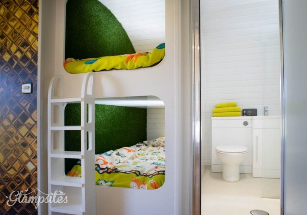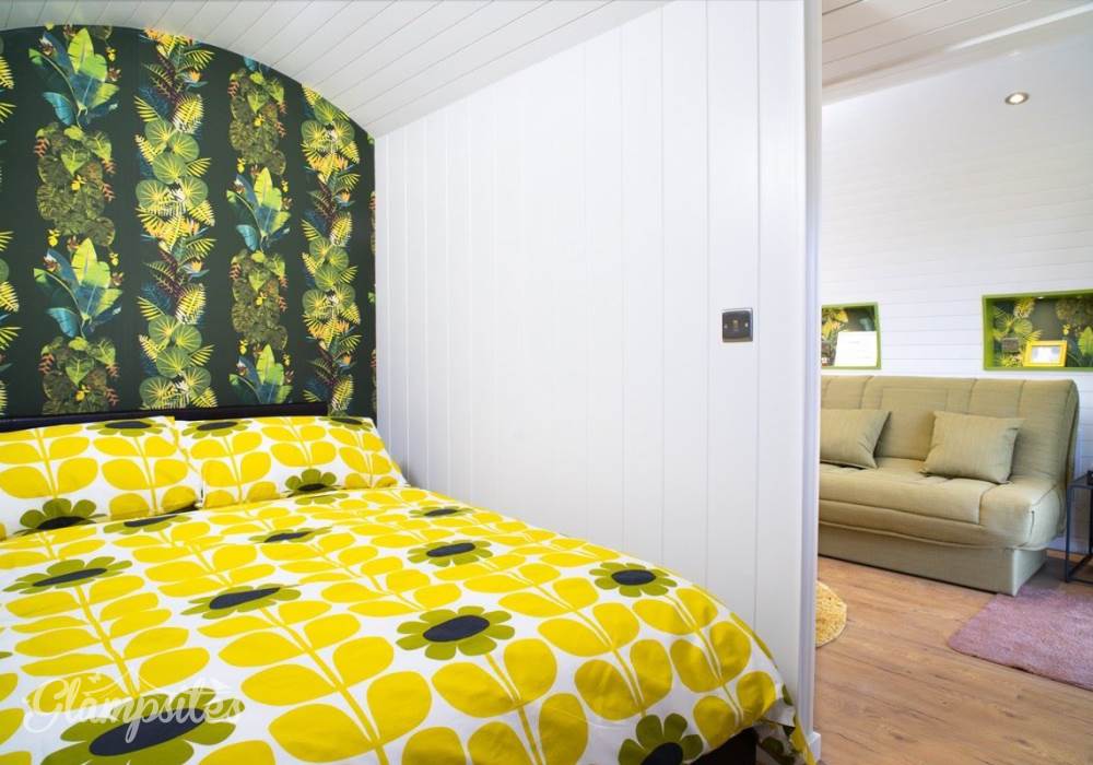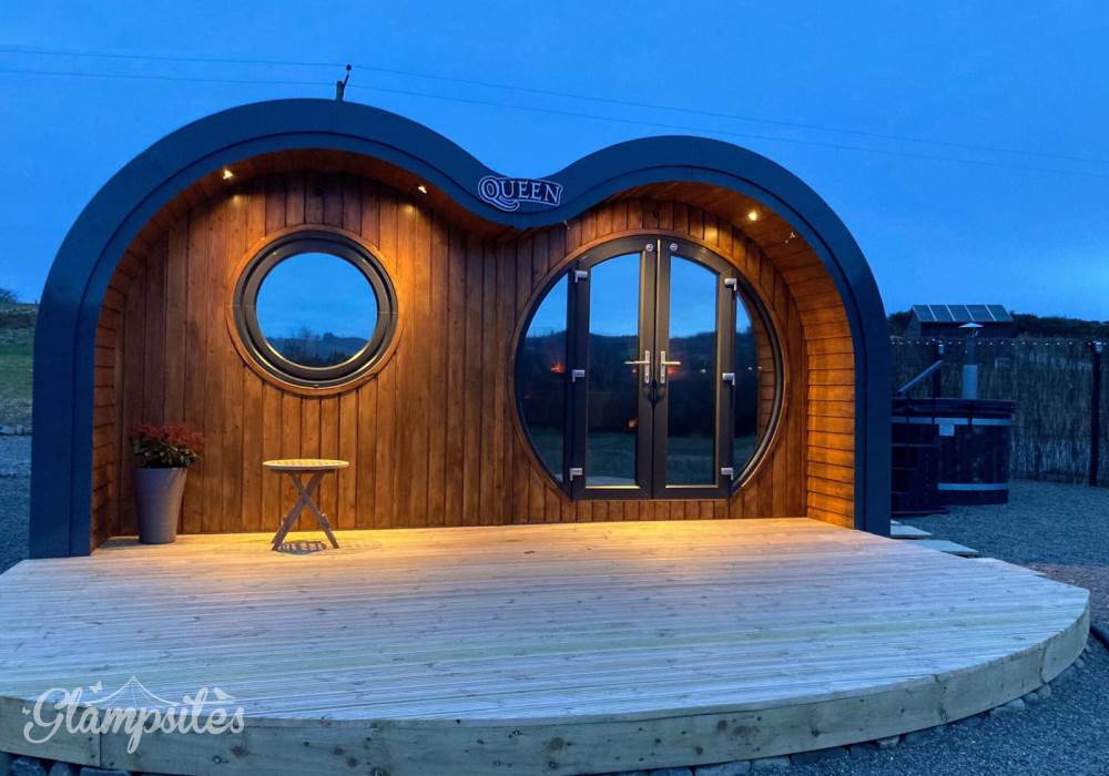 Our retro-themed Queen LodgePod has its own luxury deluge shower and toilet and a proper kitchen with a 2-ring induction hob, built-in microwave grill and a large fridge freezer allowing the gourmet in you to shine through should you so choose. The pod also boasts a cosy central heating system for year-round stays.