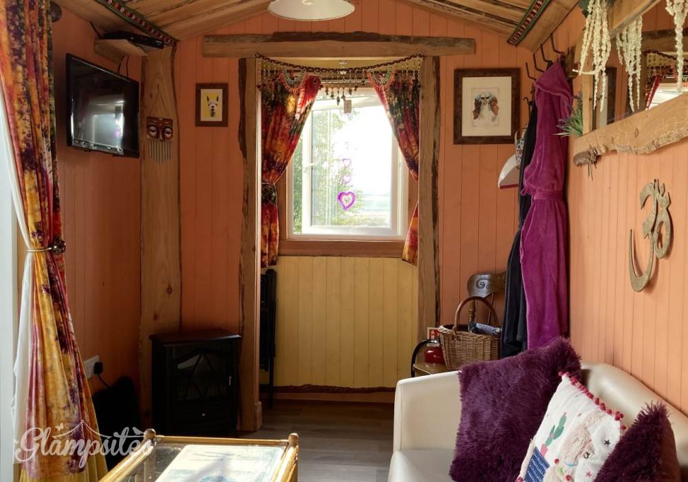 Outside, Daisy is set in an elevated position in its own area with fire pit (logs, kindling and fire lighters are available for a small charge), picnic bench, BBQ stand (disposable BBQs available at small charge) and outdoor seating with shawls and blankets to sit out in the evening to enjoy the amazing sunsets over the mountains.