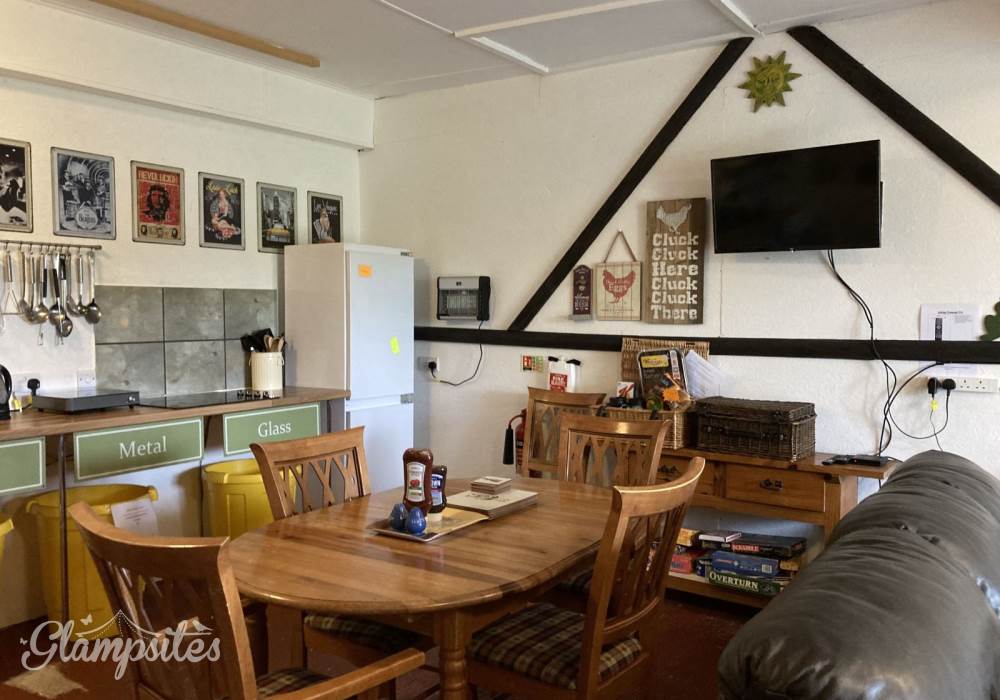 Glamping guests have full use of the glamping kitchen which includes dining table and comfy seating area. Kitchen facilities include electric hob, microwave, toaster, kettle and fridge freezer. All pots, pans, crockery, glasses, cutlery and utensils are provided.