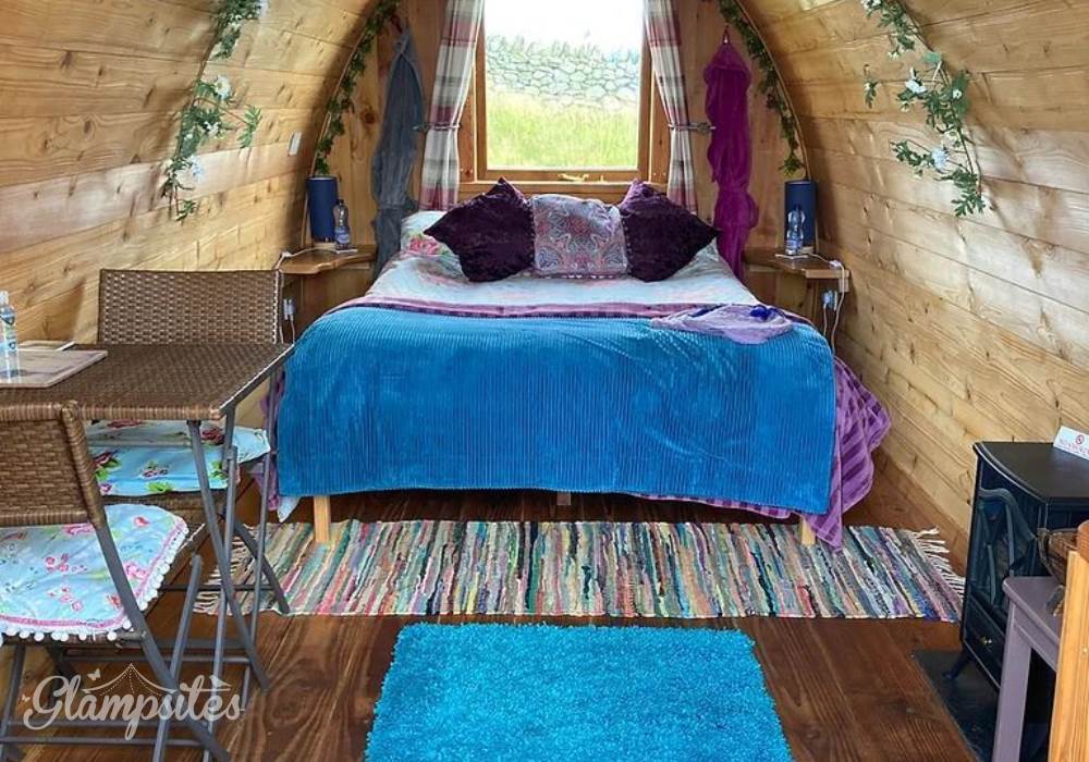 Outside, the pod is set in its own discrete area. There is a private fire pit area (logs, kindling and fire lighters are available for a small charge), picnic bench, BBQ stand (disposable BBQs available at small charge) and outdoor seating with shawls and blankets to sit out in the evening to enjoy the amazing sunsets over the mountains.