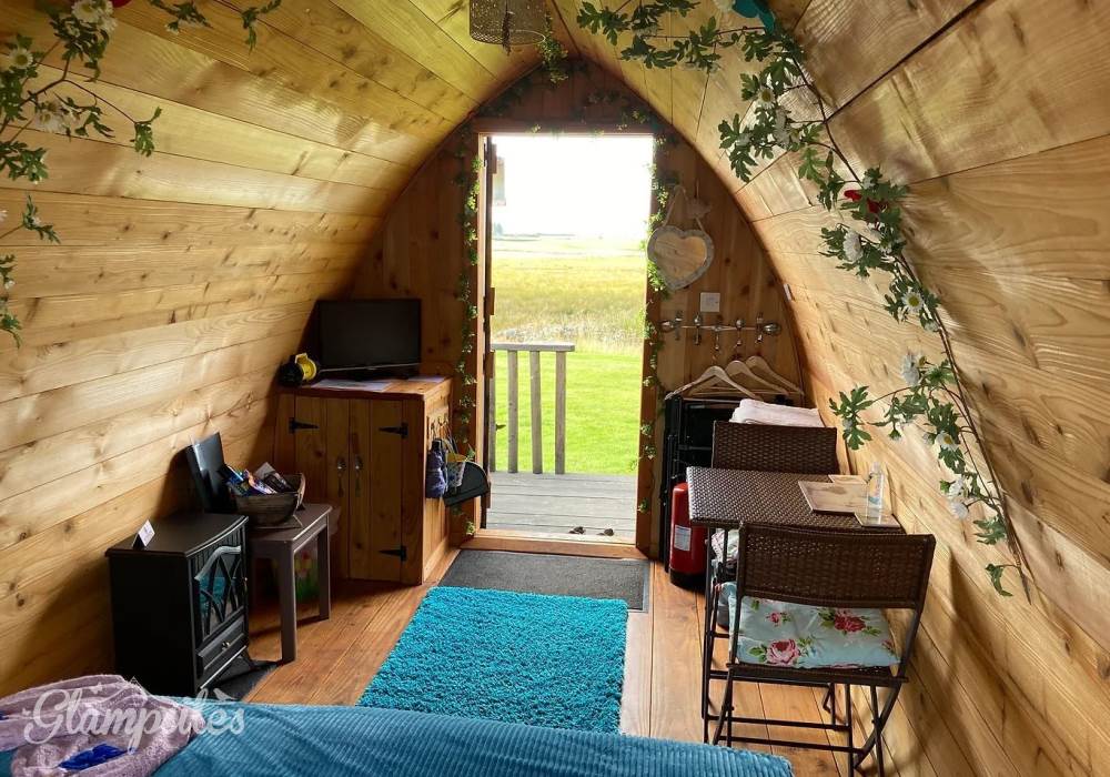 The glamping kitchen also offers dining and sitting area where you can sit and eat in comfort. The large TV in the kitchen has Freesat allowing you to sit and watch your favorite shows should the weather not be so kind in and around the pod.