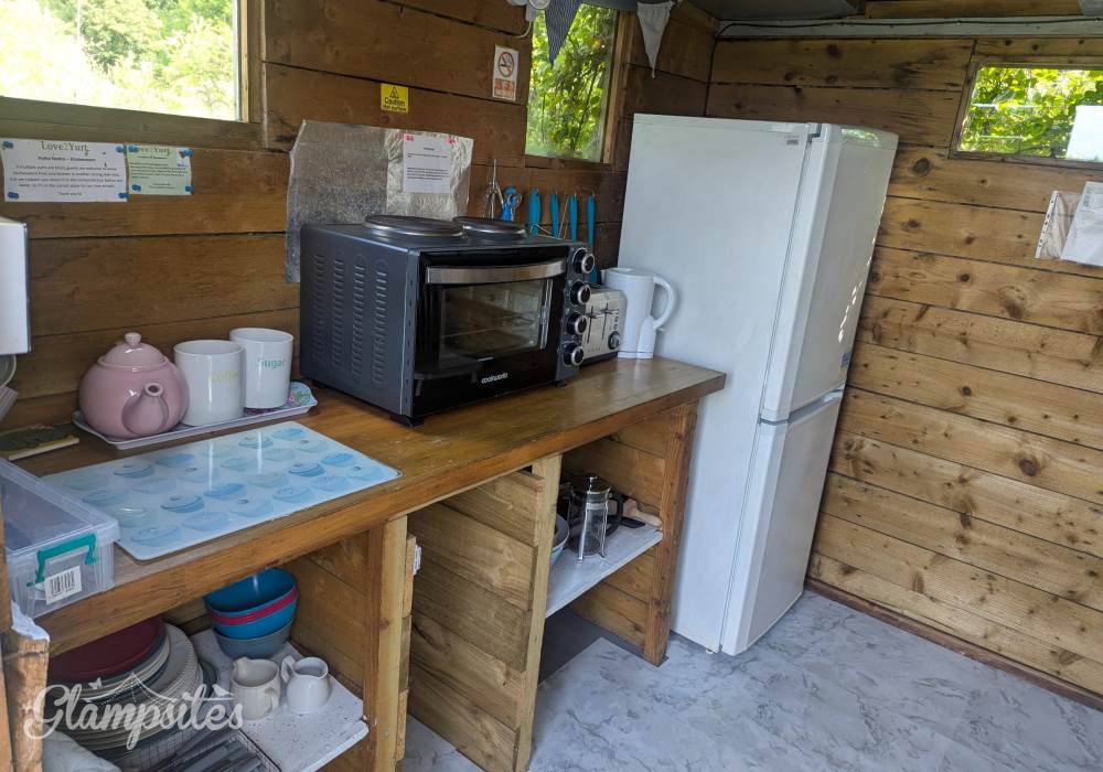The Kitchen: Located within 5 metres of your yurt, your private kitchen is fully equipped with an electric mini-oven, fridge-freezer, and all the crockery and cookware you need to whip up a local feast.