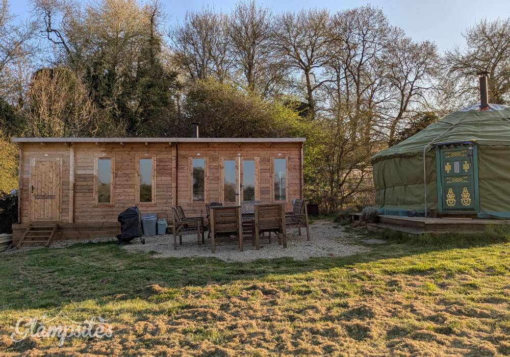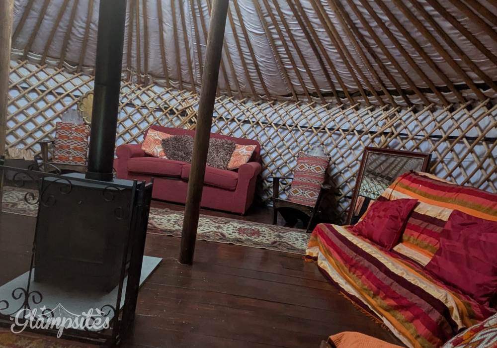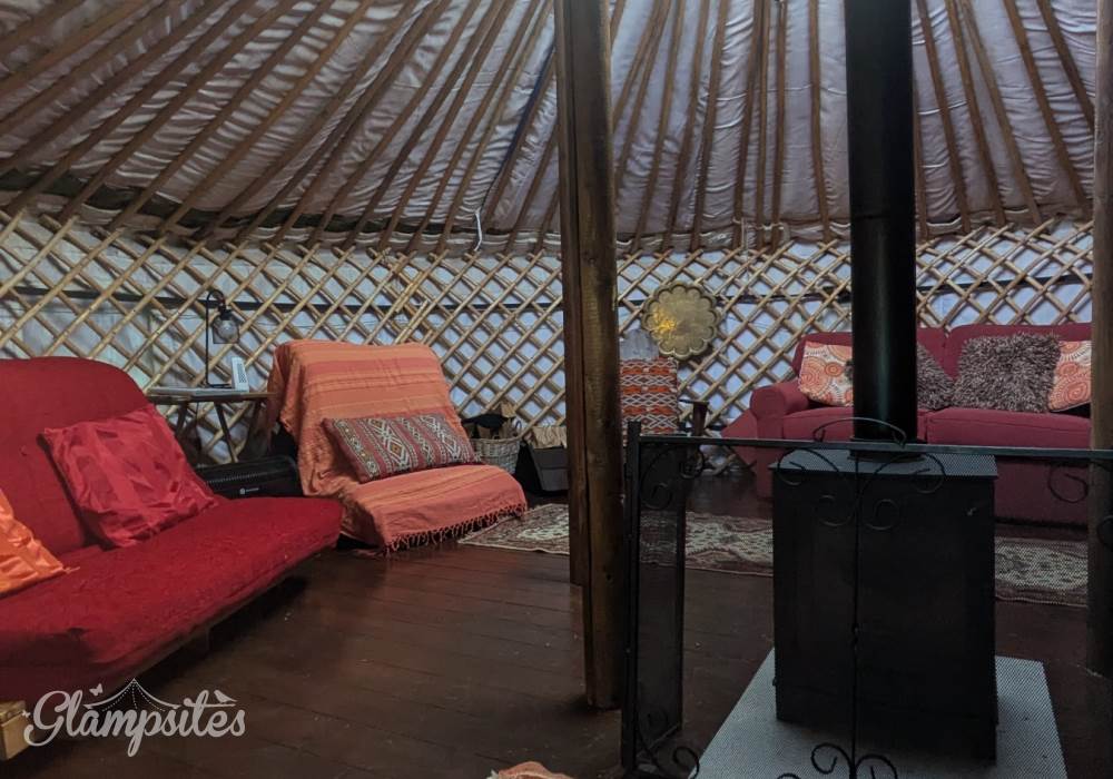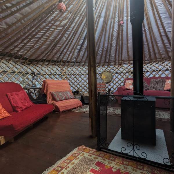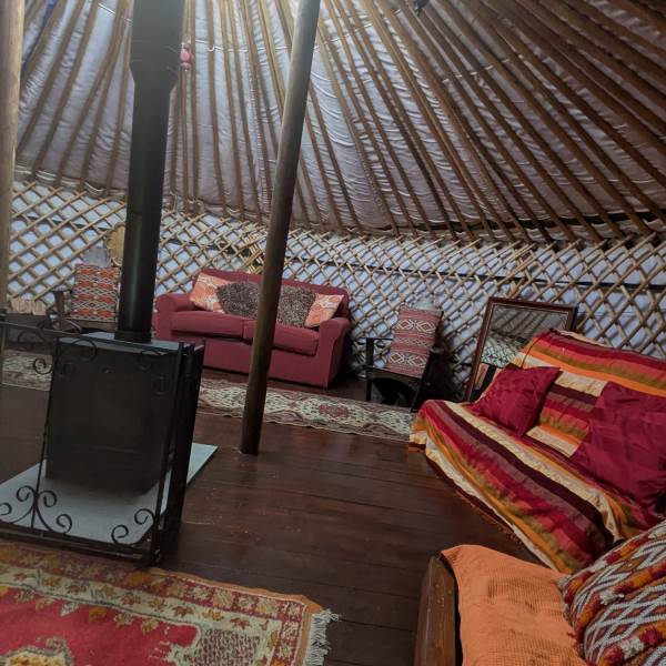 The flexible sleeping arrangements include one double sofa bed, two double futons, and two single futons—which double as comfortable lounge seating during the day. To keep things toasty, the yurt features a large wood-burning stove (stocked with logs, coal, and kindling) plus an electric radiator for that "instant" touch of warmth.