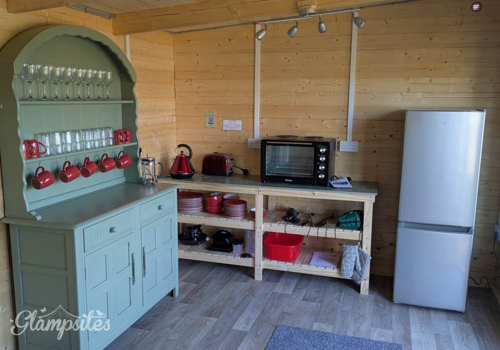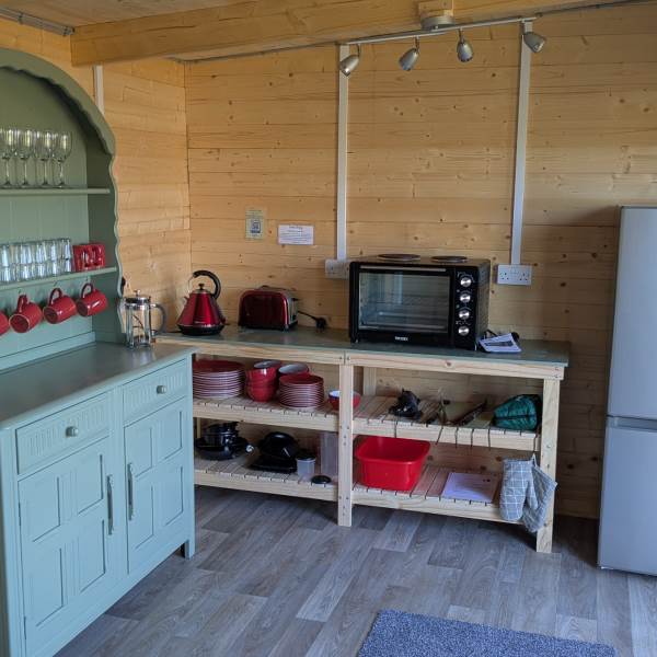 Chef’s Kitchen: Integrated directly into your dining cabin for ultimate convenience. It’s fully equipped with a two-hob mini oven, a large fridge-freezer, toaster, and all the glassware and cookware needed for a group banquet.