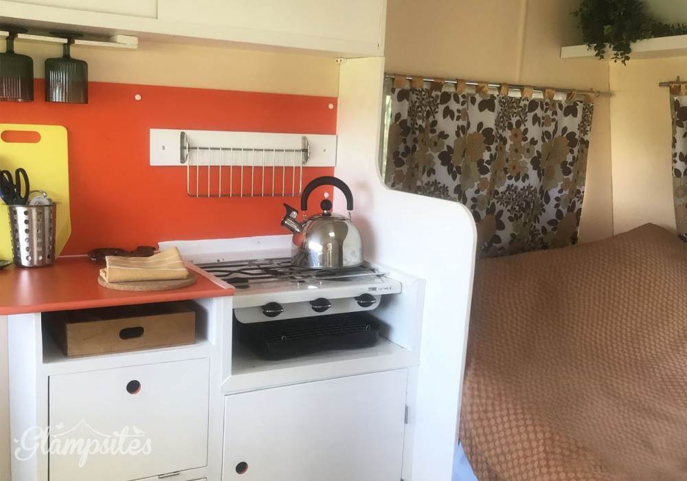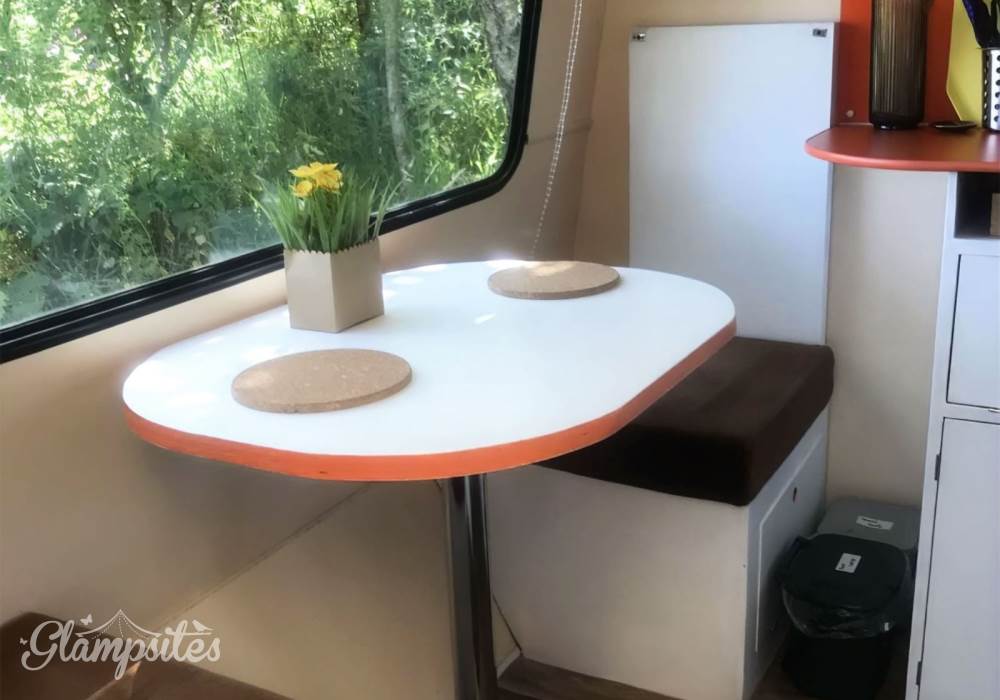 Despite her compact size, Margo is ingeniously designed to offer comfort and functionality. Inside, guests will find a cosy small double bed, ensuring a restful night's sleep. The fully equipped kitchen allows for culinary adventures, complete with a two-hob gas cooker and grill, perfect for whipping up delicious meals. Additionally, a table and two seats provide a charming space for dining or relaxing indoors.