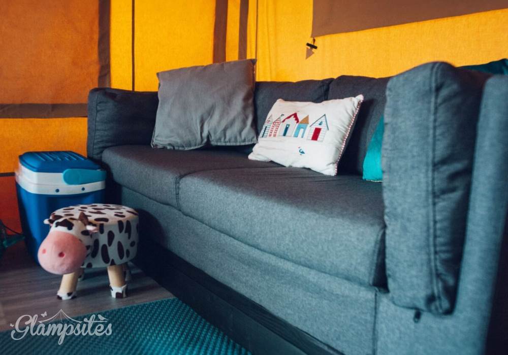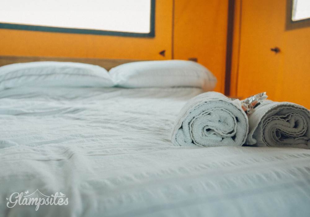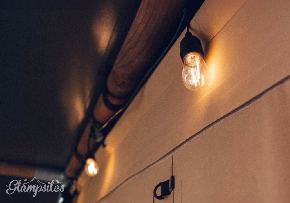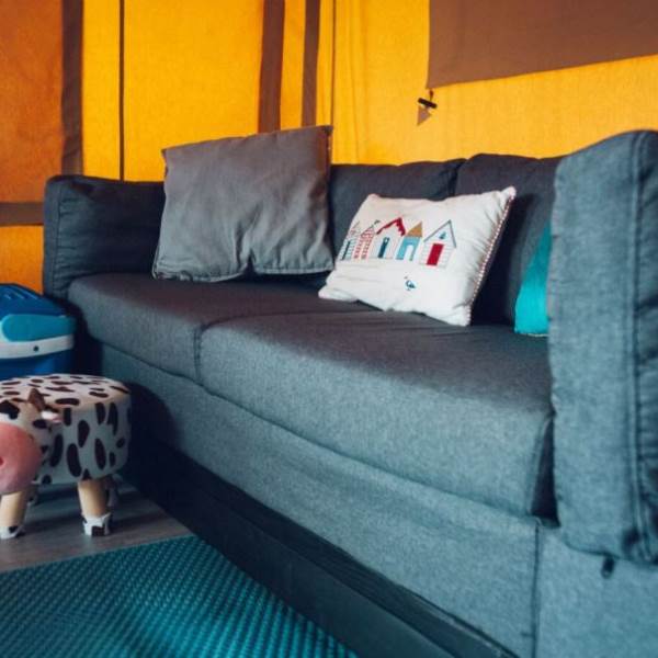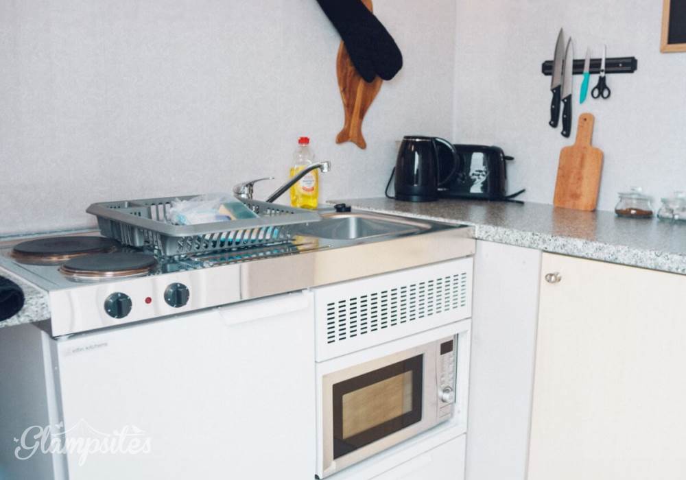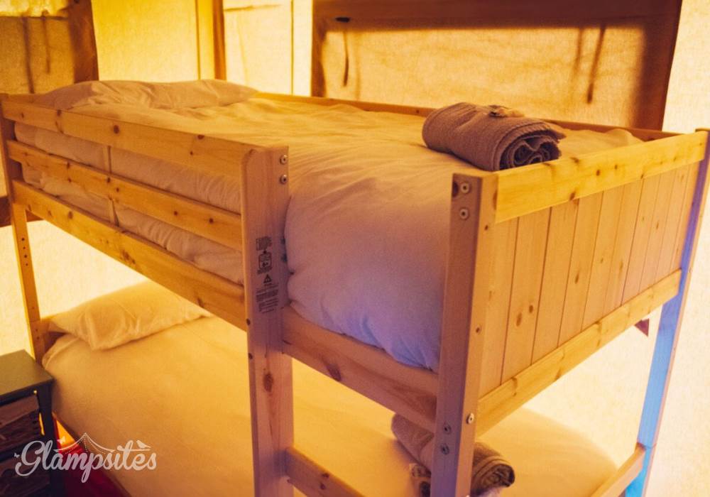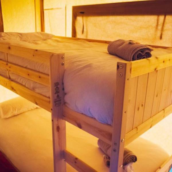 Sleeping up to four guests, the tent consists of one double bedroom and one bunkbed room, making these tents perfect for a small family or a couple. There is an open plan living area with cosy indoor wood burner together with electric heaters on the walls. The beds have comfortable mattresses, fine cotton bedding and feather duvets. Directly next to the tent there is an private kitchenette pod and toilet/shower room..The external pod has a gas hob, microwave and small electrical appliances.
