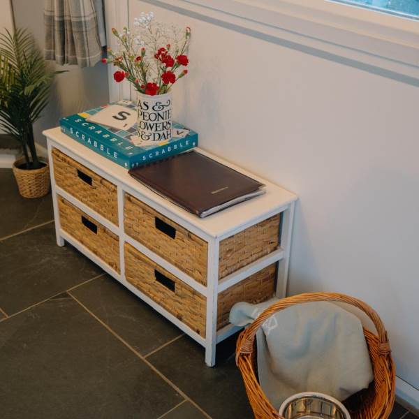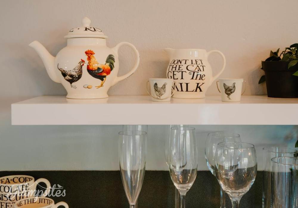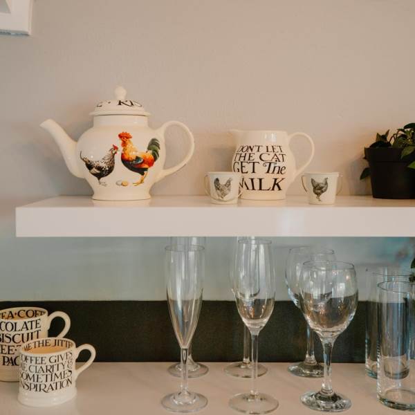 The well-appointed kitchen opens into the living and dining spaces, boasting an electric oven and hob, a fridge with a large ice box, a microwave, and a Nespresso coffee machine to brew your essential morning coffee. Adorned with stunning Emma Bridgewater crockery, this modern kitchen elevates your culinary experience.