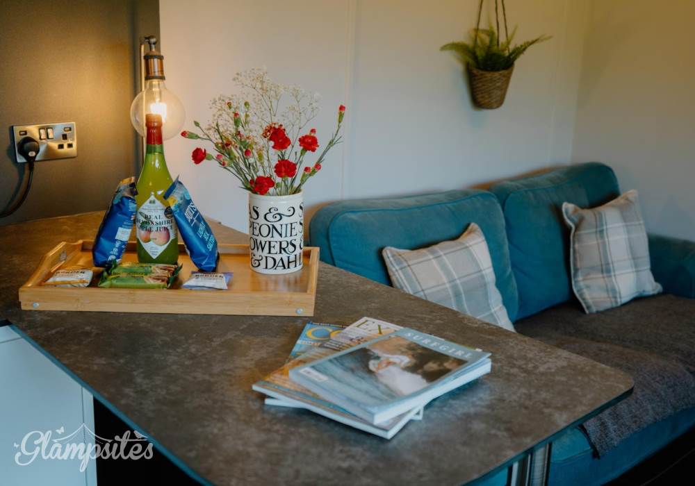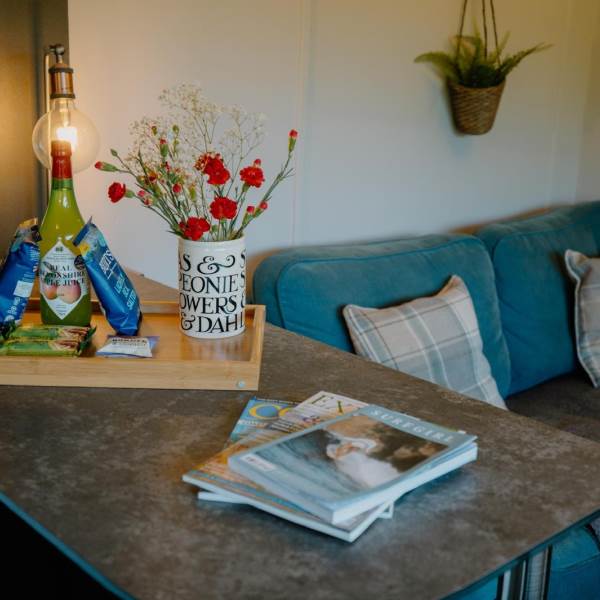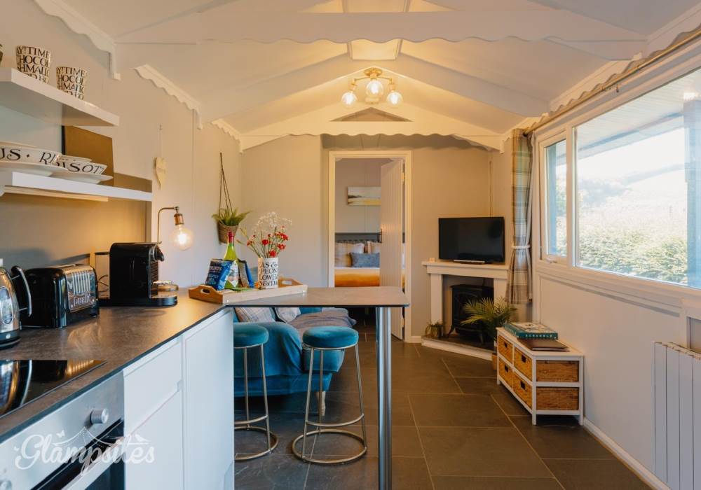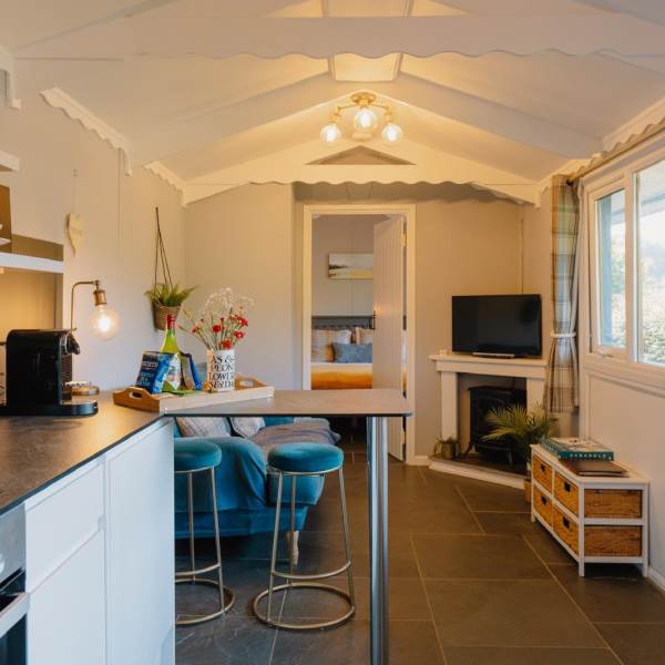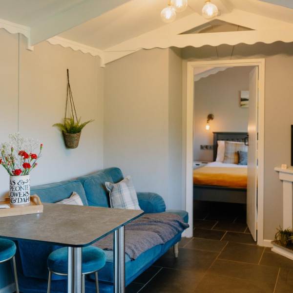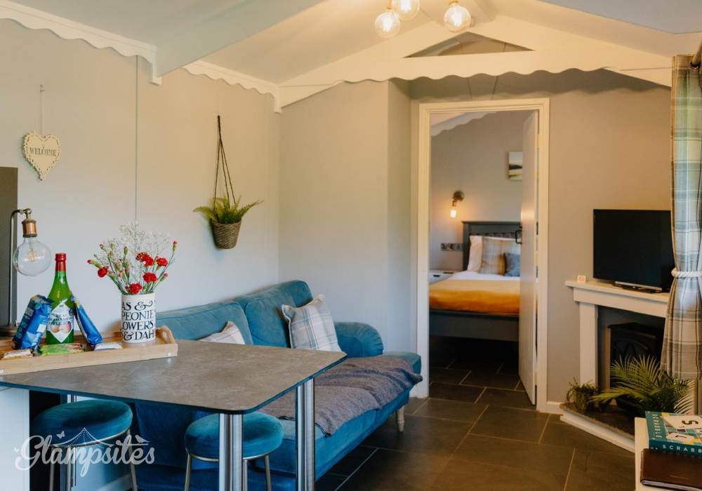 The open-plan living area seamlessly combines comfort and style, featuring a cozy sofa for two, a wood-burner effect electric fire, and a flat-screen smart TV (bring your own accounts for Netflix/Amazon Prime) for those cozy nights in.