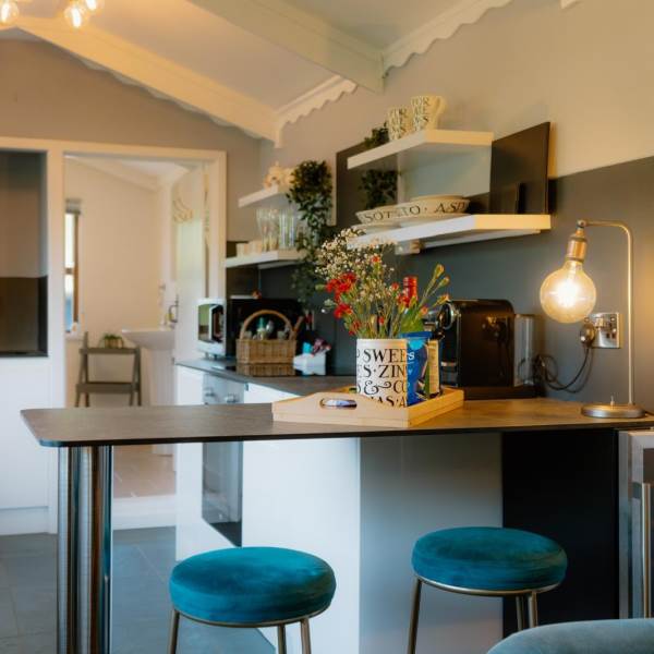 Also open-plan, the dining area features a stylish breakfast bar with seating for two, perfectly positioned to overlook the enchanting fields.