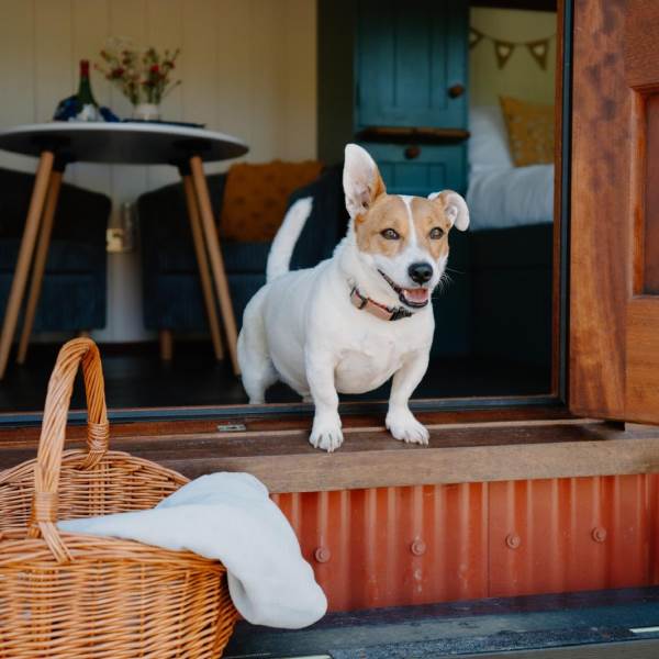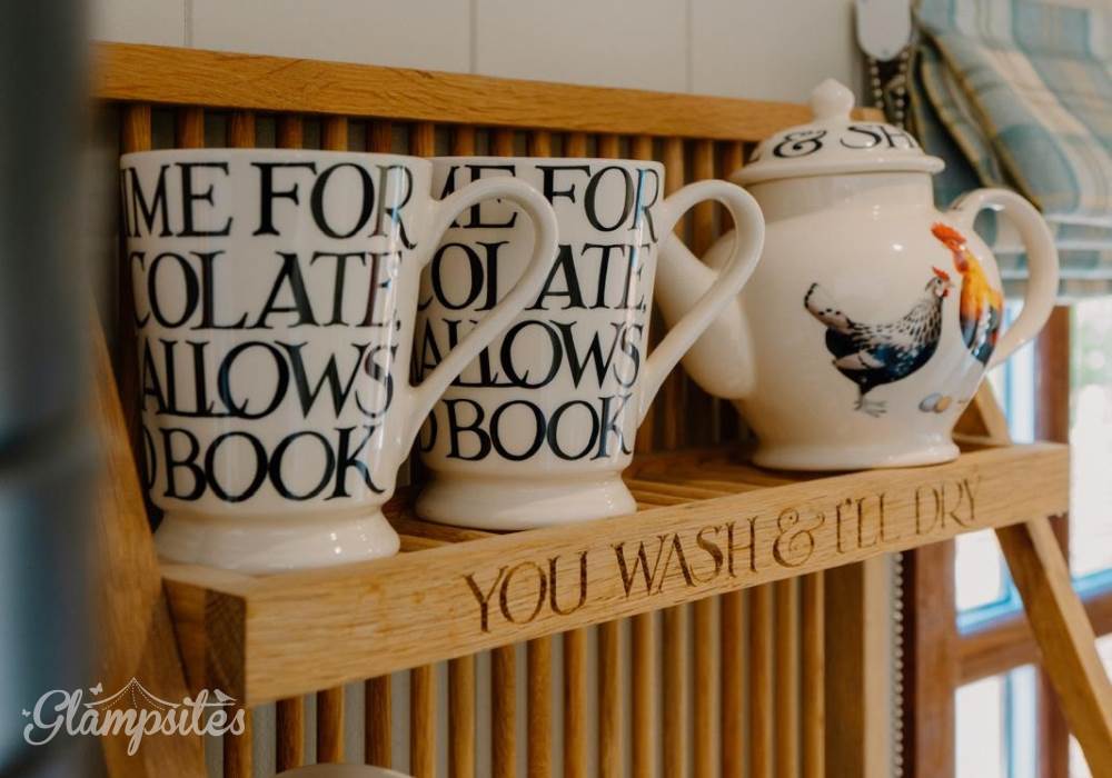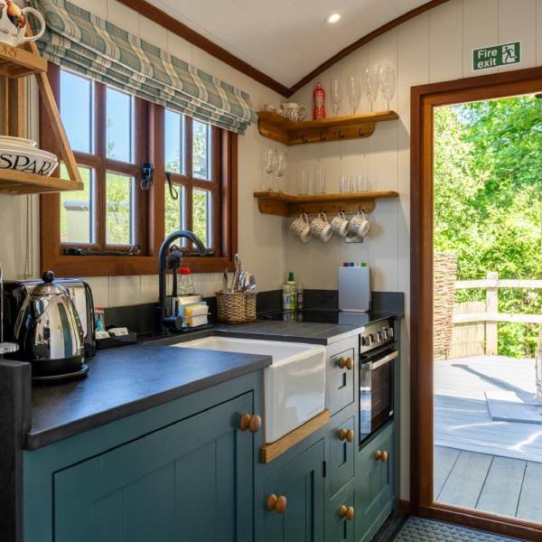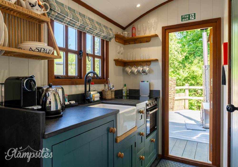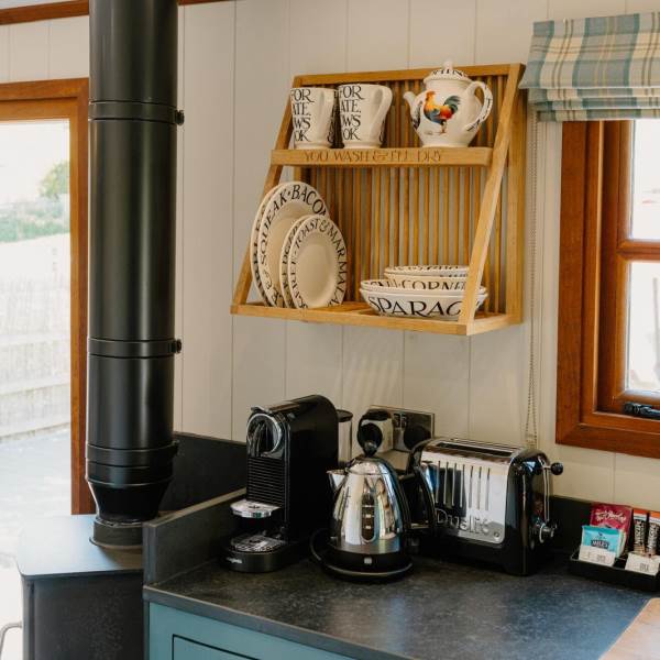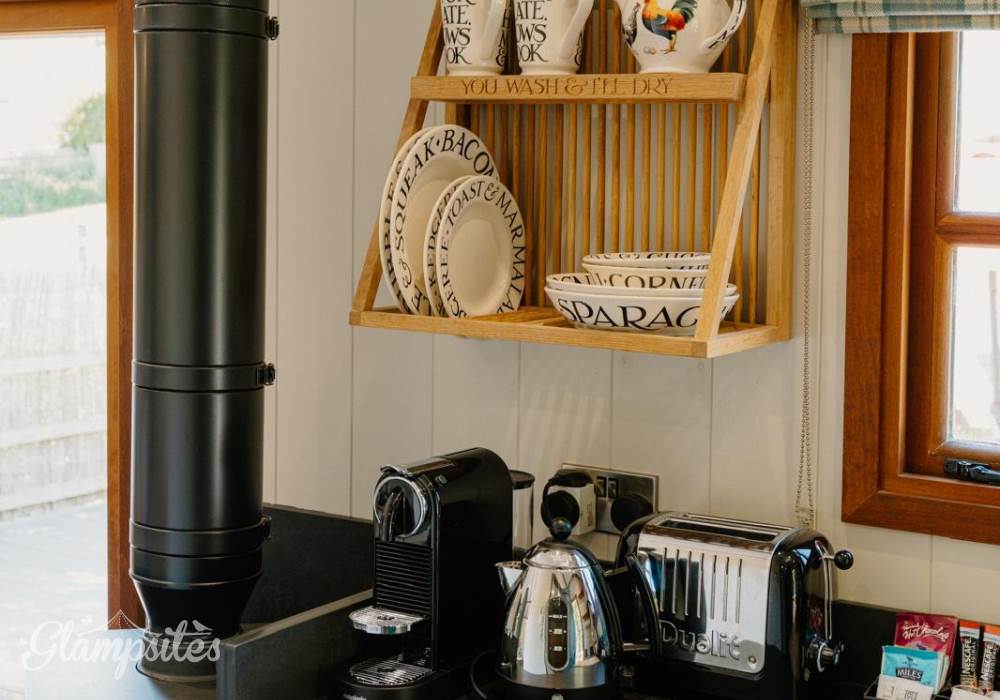 The kitchen, open to the living space, includes a mini oven with a gas hob, an under-counter fridge with a generous ice box, a Nespresso coffee machine, and a Dualit kettle and toaster. Start your mornings right with our lovely Emma Bridgewater tableware, perfect for breakfast in bed.