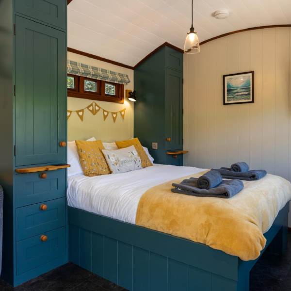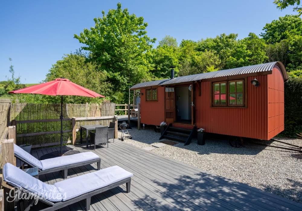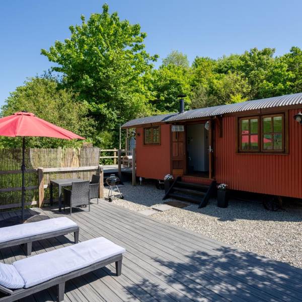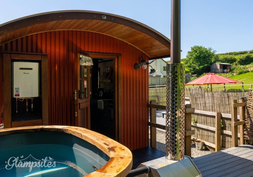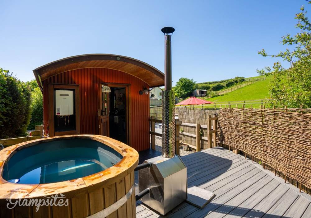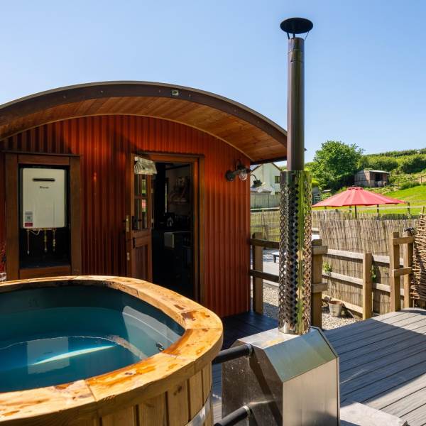 Escape to one of our two beautifully designed large Shepherd’s Huts on the farm, complete with a wood-fired hot tub, wet room, and kitchenette. Nestled by a tranquil stream near Croyde, you’ll enjoy stunning field views of our alpacas and more. This is the perfect setting for mini-moons, anniversaries, birthdays, or simply a refreshing break from the demands of work and city life. Experience glamping at its finest with underfloor heating, a log burner, and sun loungers at your disposal. Pastures Green is the pinnacle of 5-star luxury glamping at North Hole Farm Holidays, featuring its own hot tub, en-suite bathroom, high-speed WiFi, and a smart TV, ensuring total privacy and comfort.