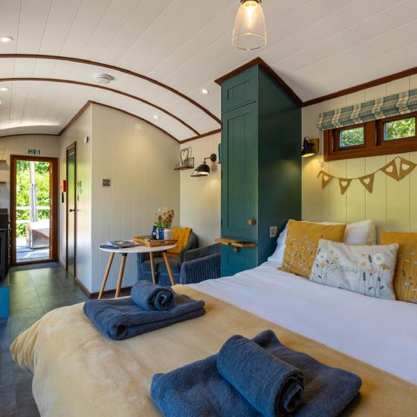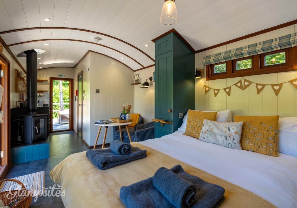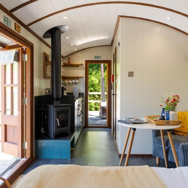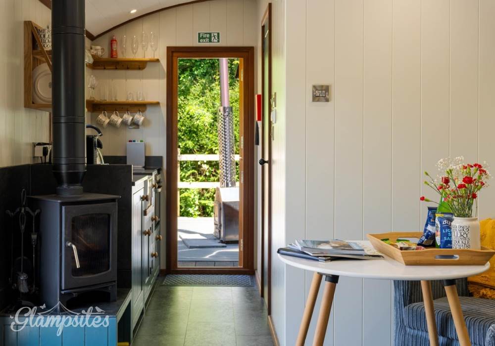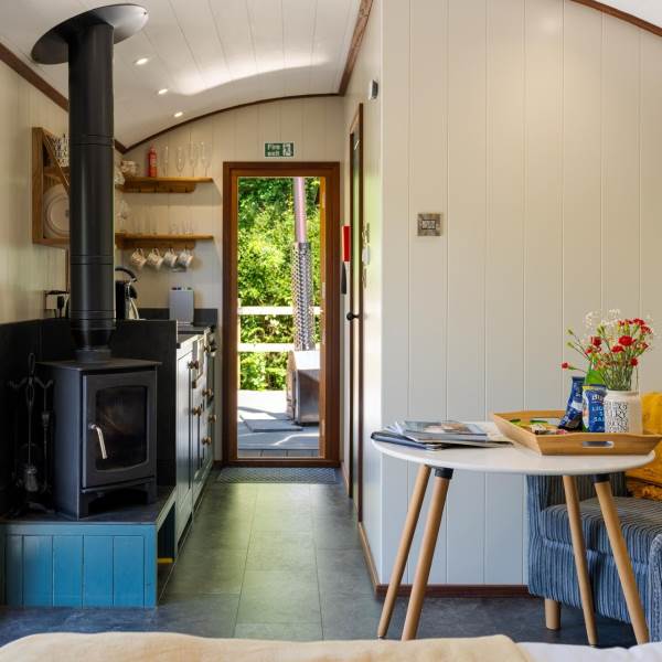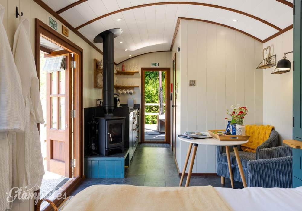 The open-plan layout seamlessly combines the kitchen and bedroom areas, featuring two cozy armchairs, a dining table, a wood burner, and a flat-screen smart TV (bring your own accounts for Netflix/Amazon Prime). Enjoy the comfort of underfloor heating throughout.