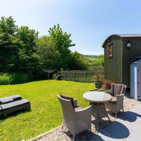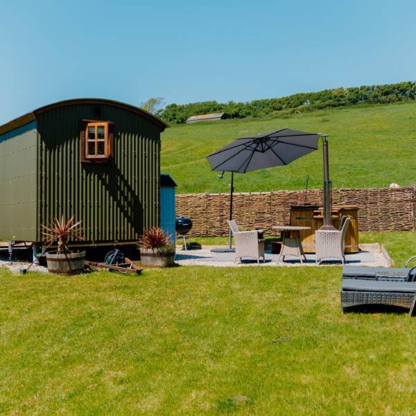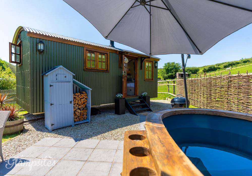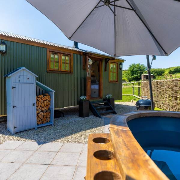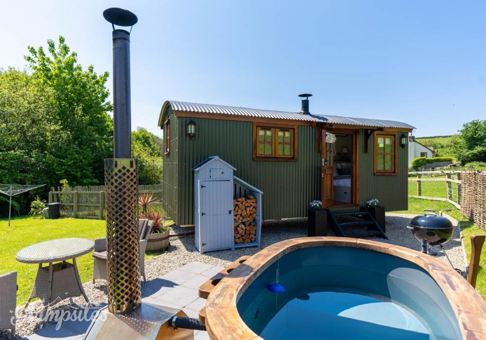 One of two Well designed, cozy, Shepherds Huts on our farm, with kitchenette,bathroom, bedroom, wood burner and underfloor heating, sited remotely by a stream, on a working organic dairy farm , with countryside views.Away from the noise, but central to all the popular surfing beaches and south west coast path. Complete with wood burning hot tub for relaxing in after walking/surfing the local beaches . An ideal countryside escape from the stress of work or for a romantic short break or mini-moon.