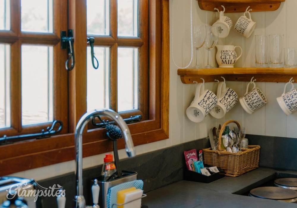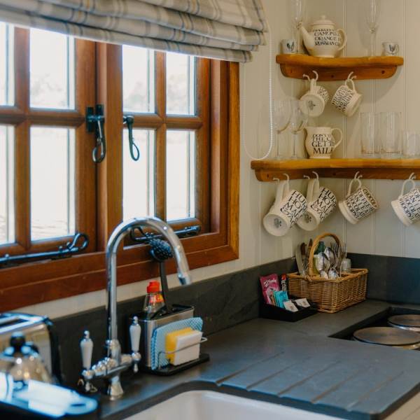A mini oven with electric hob, small fridge with small ice box, a Nespresso coffee machine, a Dualit kettle and toaster and Emma Bridgewater tableware to compliment your morning breakfast in bed.