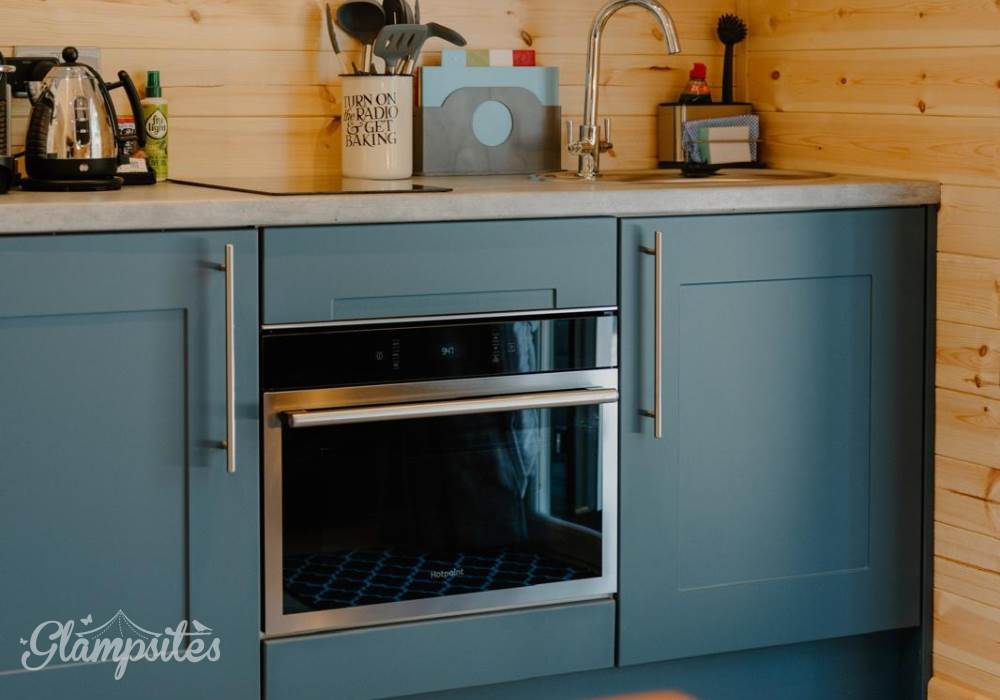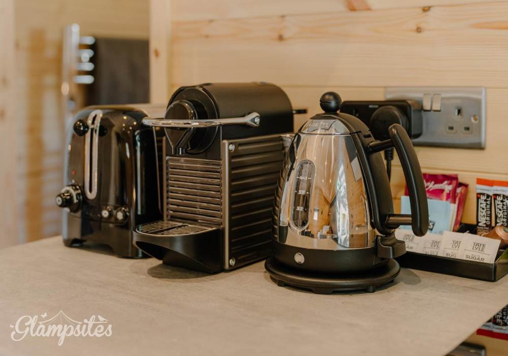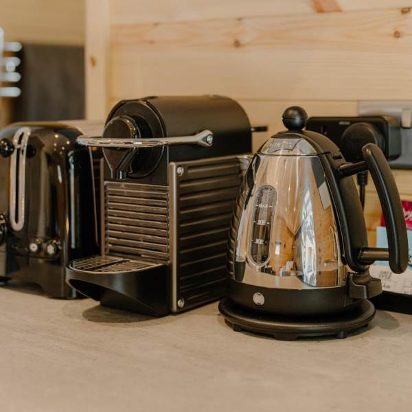 The modern kitchenette is designed for both functionality and charm. Equipped with a combi oven and electric hob, an under-counter fridge with a large ice box, a Nespresso coffee machine, and a Dualit kettle and toaster, it has everything you need to whip up a romantic breakfast in bed, complete with stunning Emma Bridgewater tableware.