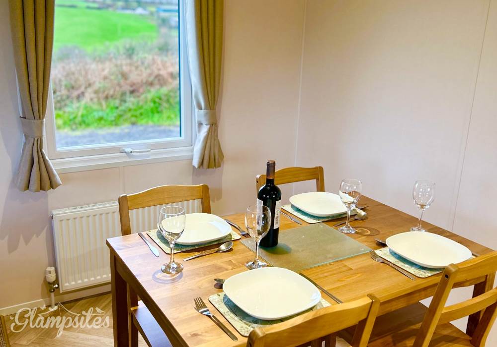 The lounge area offers two gorgeous comfy leather sofas which are perfect for viewing the large screen tv provided although to be honest, it will be difficult to resist opening up the French doors that lead you to the private decking area and again, towards those salivating views!