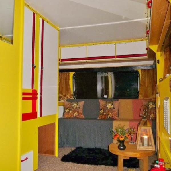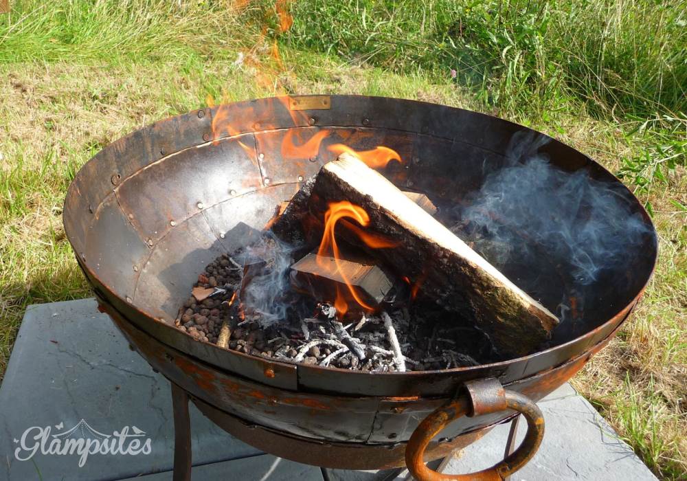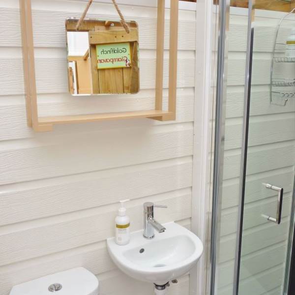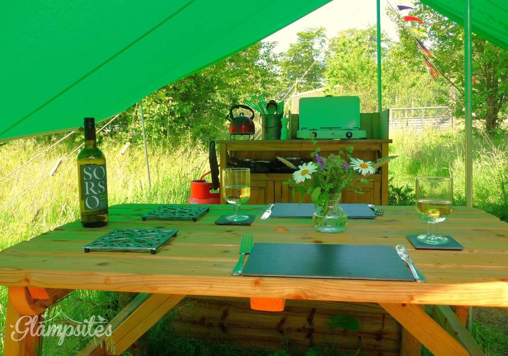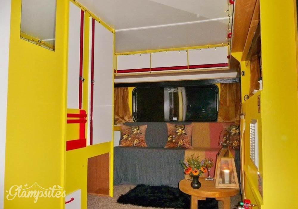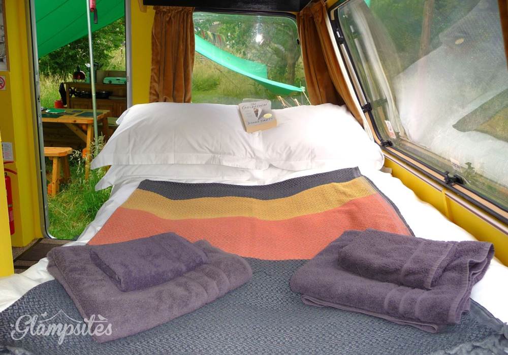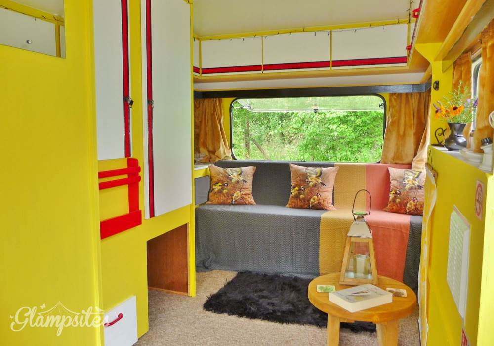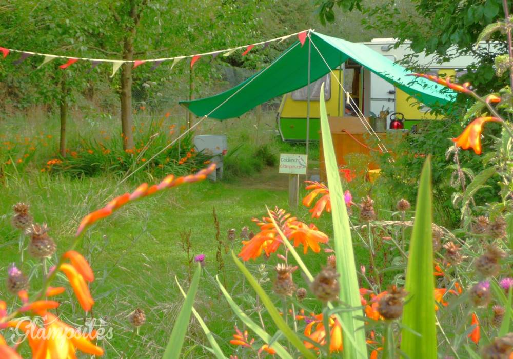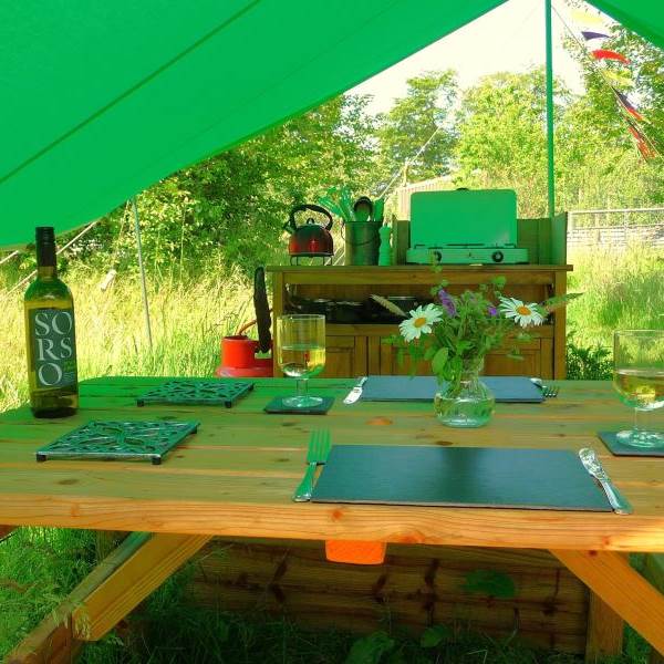 Goldfinch Glampavan is furnished and decorated in the bright, beautiful colours of this pretty garden bird. There is a small double bed inside, plus somewhere to sit by the candlelight during the evening (which can double up as an extra bed), and a field kitchen outside. There is an additional Kadai firebowl for barbecues plus a wood-fired pizza oven. There are private mains shower and flush toilet facilities and a shared kitchen sink area. Sleeping two adults and one child (age 5-12; bring sleeping bag for child), Goldfinch Glampavan is available from May to September for off-grid short breaks or longer holidays