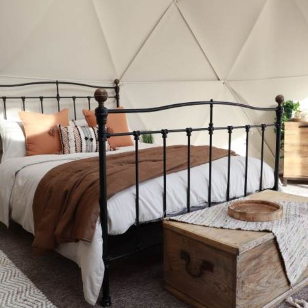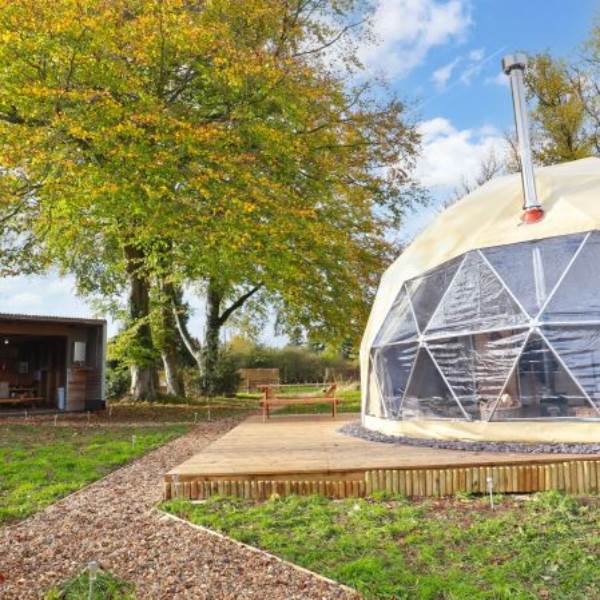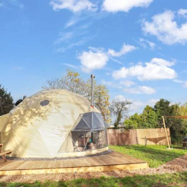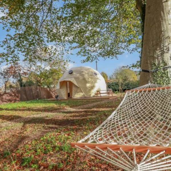 This self-contained dome has all the high-end features and lovely little extras you need for a truly romantic escape. Find yourself surrounded by nature with exclusive access to all facilities. Relax in the hot tub (building the fire is all part of the Glamping fun), enjoy a book in the hammock or why not watch a film under the stars using the projector? Get toasty around the fire-pit, or feel cosy in front of the log burner with a glass of wine or hot chocolate.