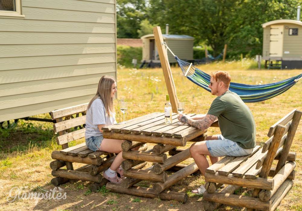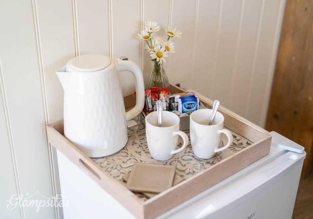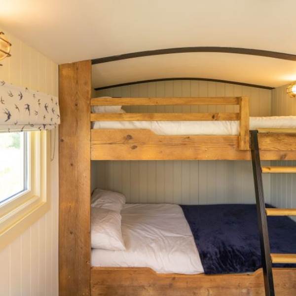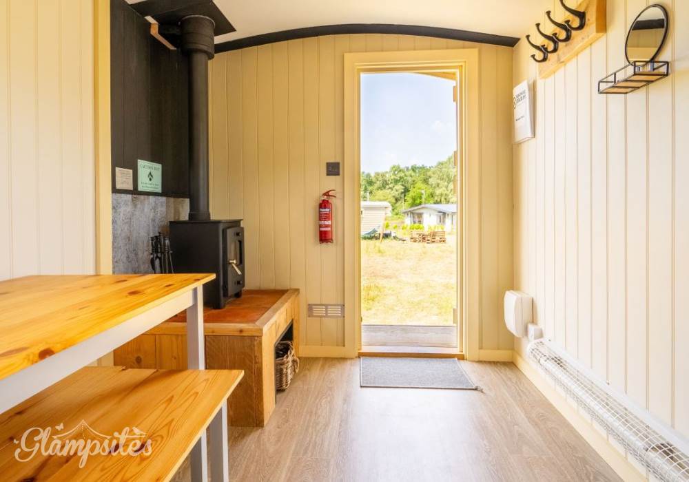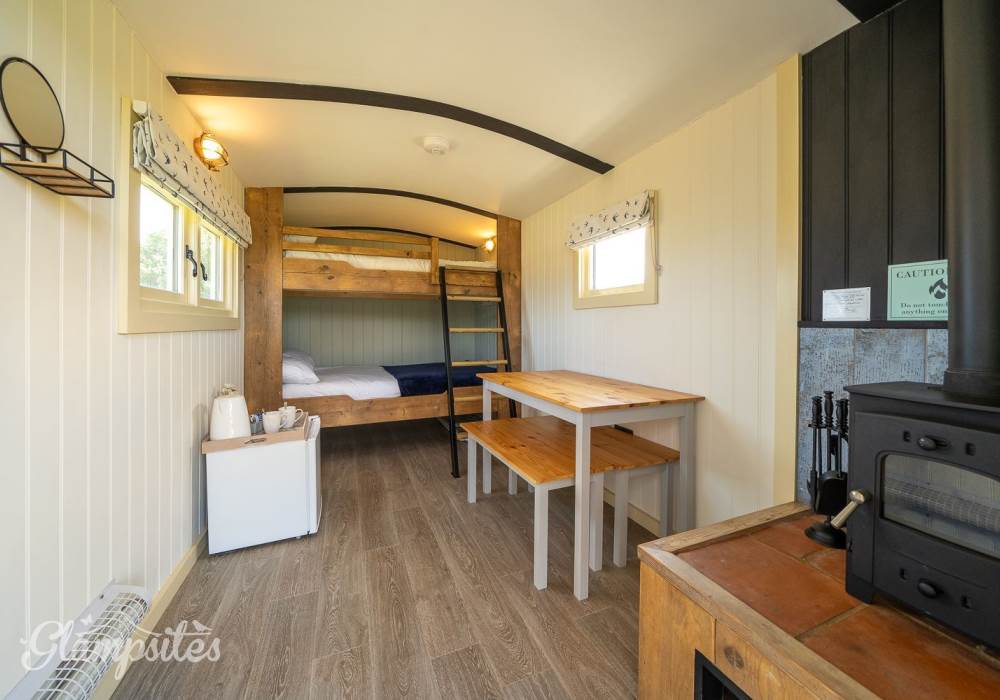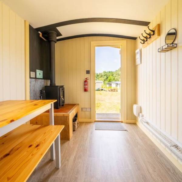 Our huts equip you with traditional handcrafted beds with memory foam mattresses. The luxury of electricity, lighting, fridges with freezer compartment and kettles, USB charging point. Tea and coffee making facilities. Outside table and chairs, Firepit/BBQ, large outside storage tub with washing up bowl, Dustpan & brush. We proudly boast a log burning stove in each hut with a complimentary basket of wood adding warmth, luxury and the ability to visit all year round.