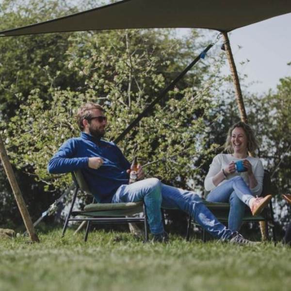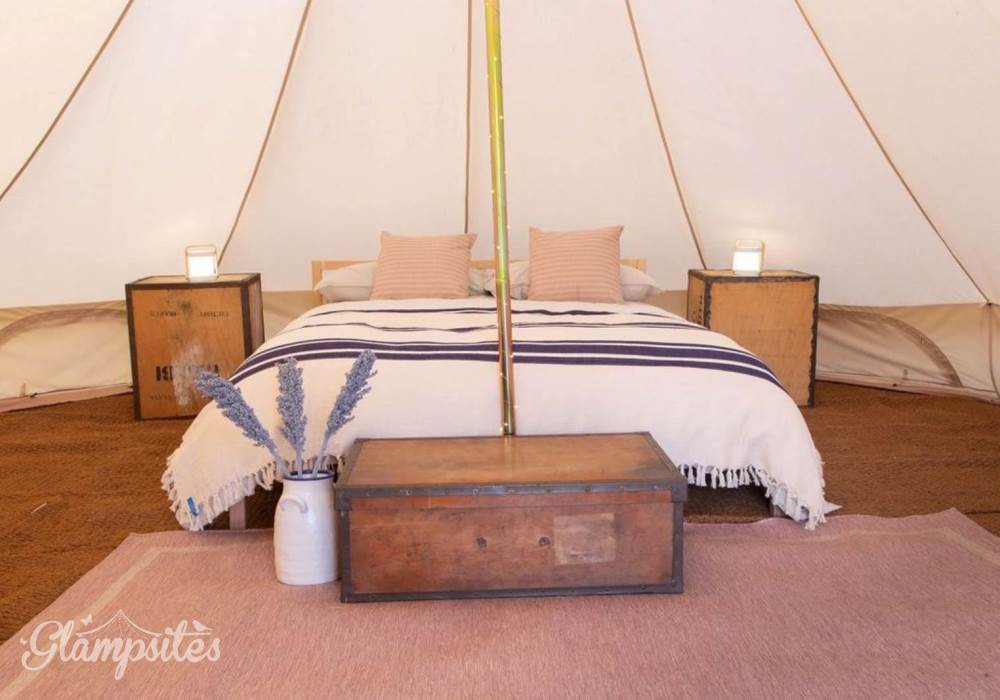 Each bell tent sleeps up to 5 people and comes with a gloriously comfortable king-sized bed with warm bedding, premium camp beds with bedding (up to 3 camp beds/cots in one tent). Travel cots suitable for up to 24 months upon request (not including bedding). Highchair also available.