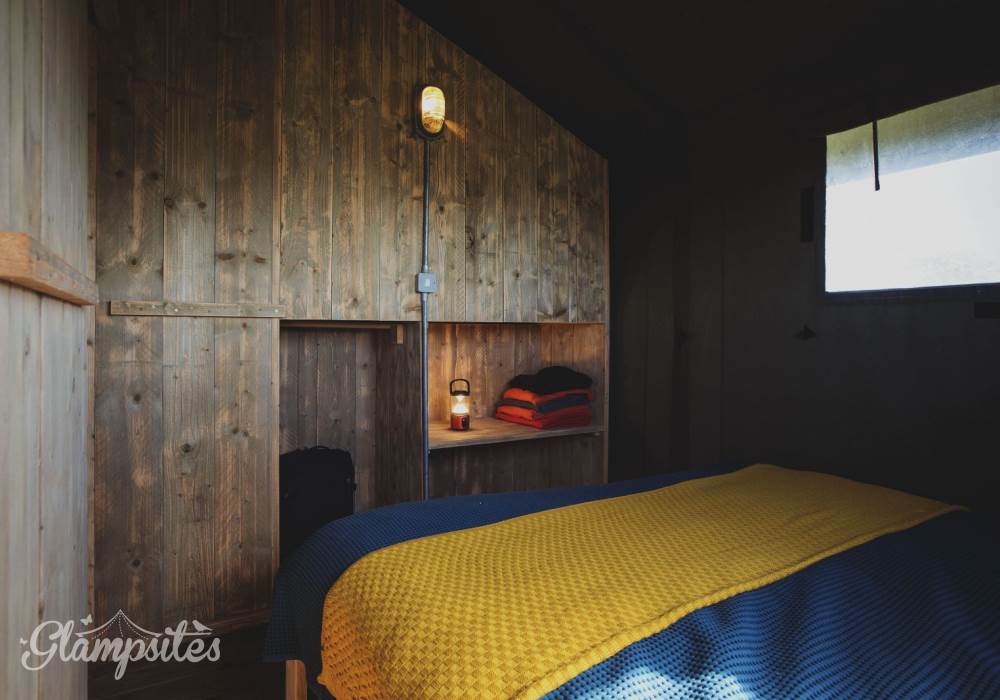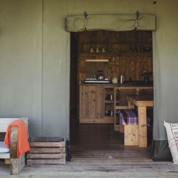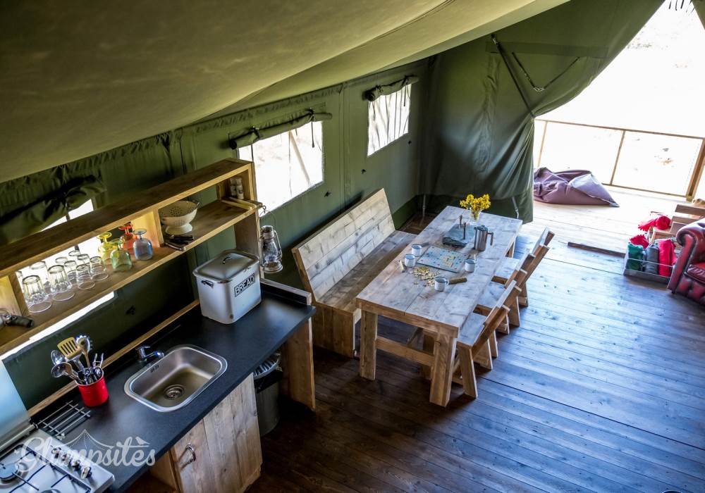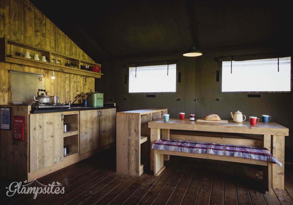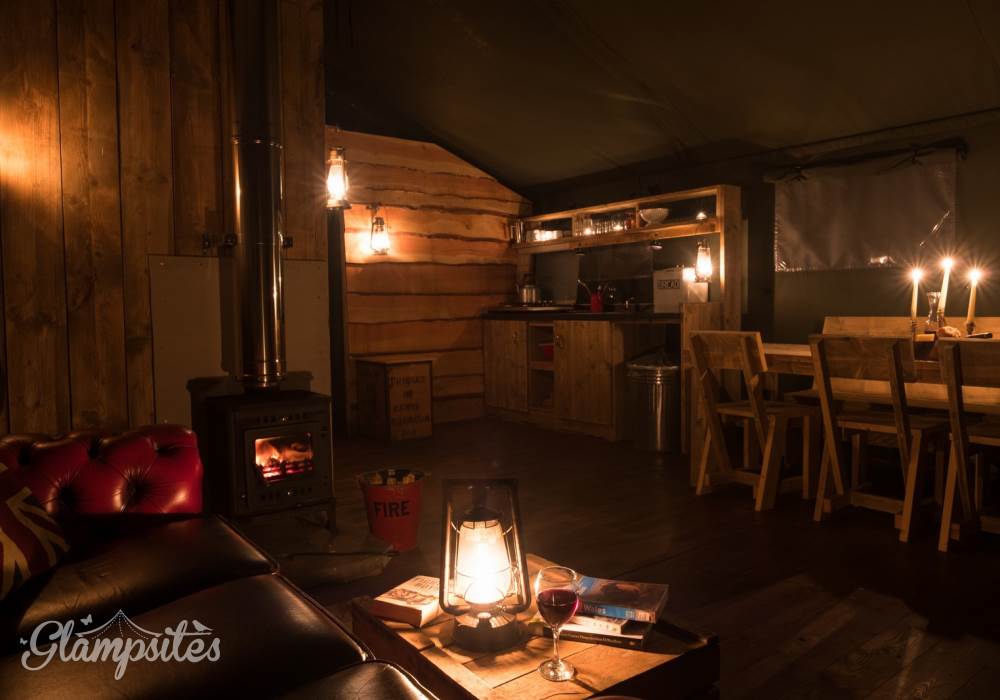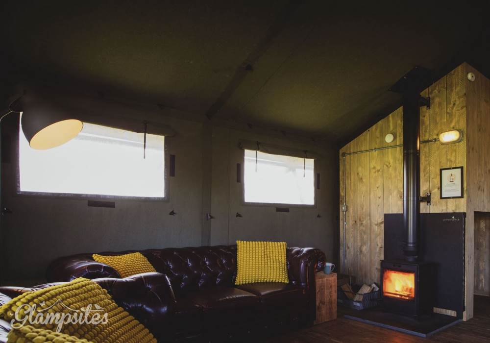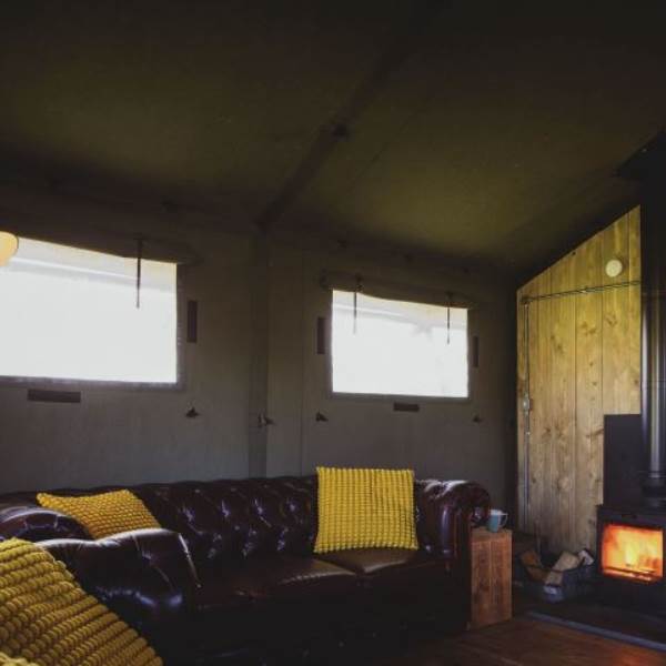 The kitchen is fully equipped with everything you should need including a gas hob, sink, cooking utensils, pots, pans, crockery, cutlery, and glassware. Each lodge is equipped with a cold locker and a private fridge is provided in the cabin near the car park. Across from the kitchen area is a full-size dining table great for a long lingering supper. Our lodges are lit with solar lighting, at the heart of the lodge is our wood-burning stove, surrounded by vintage leather chesterfields: it will keep the lodge warm in all weathers and is the perfect spot to finish the evening.