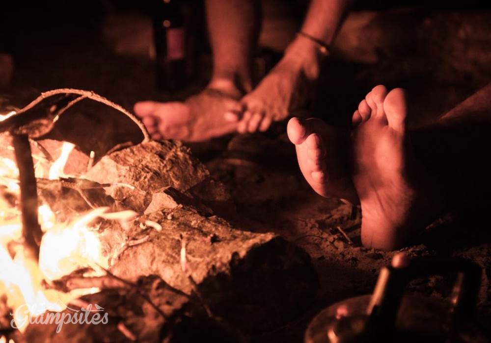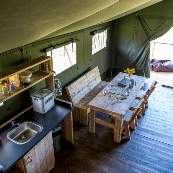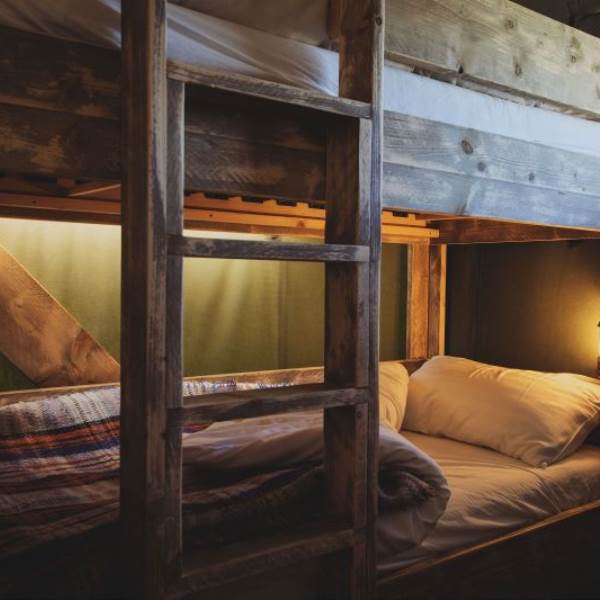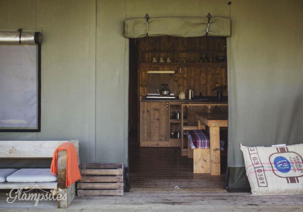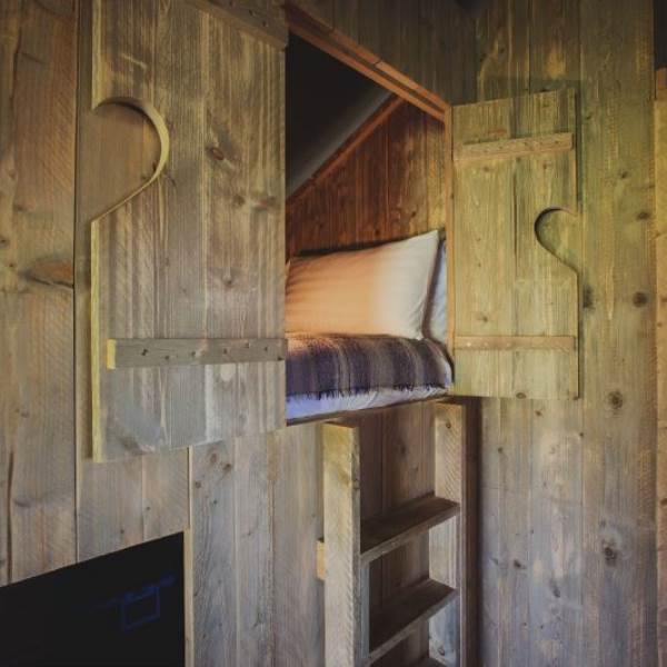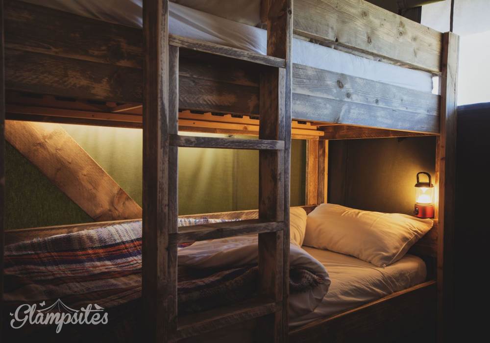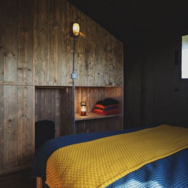 The kitchen is fully equipped with everything you should need including a gas hob, sink, cooking utensils, pots, pans, crockery, cutlery, and glassware. Each lodge is equipped with a cold locker and a private fridge is provided in the cabin near the car park. Across from the kitchen area is a full-size dining table great for a long lingering supper. Our lodges are lit with solar lighting, at the heart of the lodge is our wood-burning stove, surrounded by vintage leather chesterfields: it will keep the lodge warm in all weathers and is the perfect spot to finish the evening.