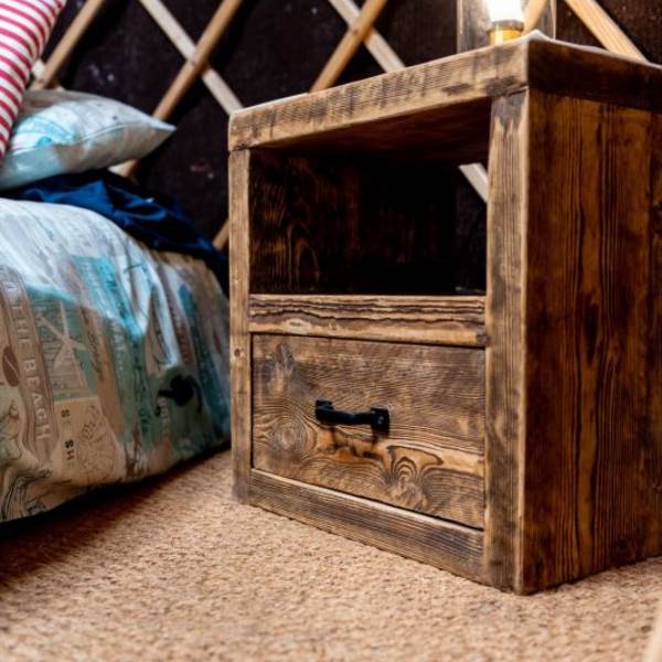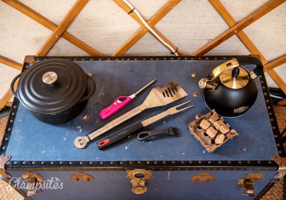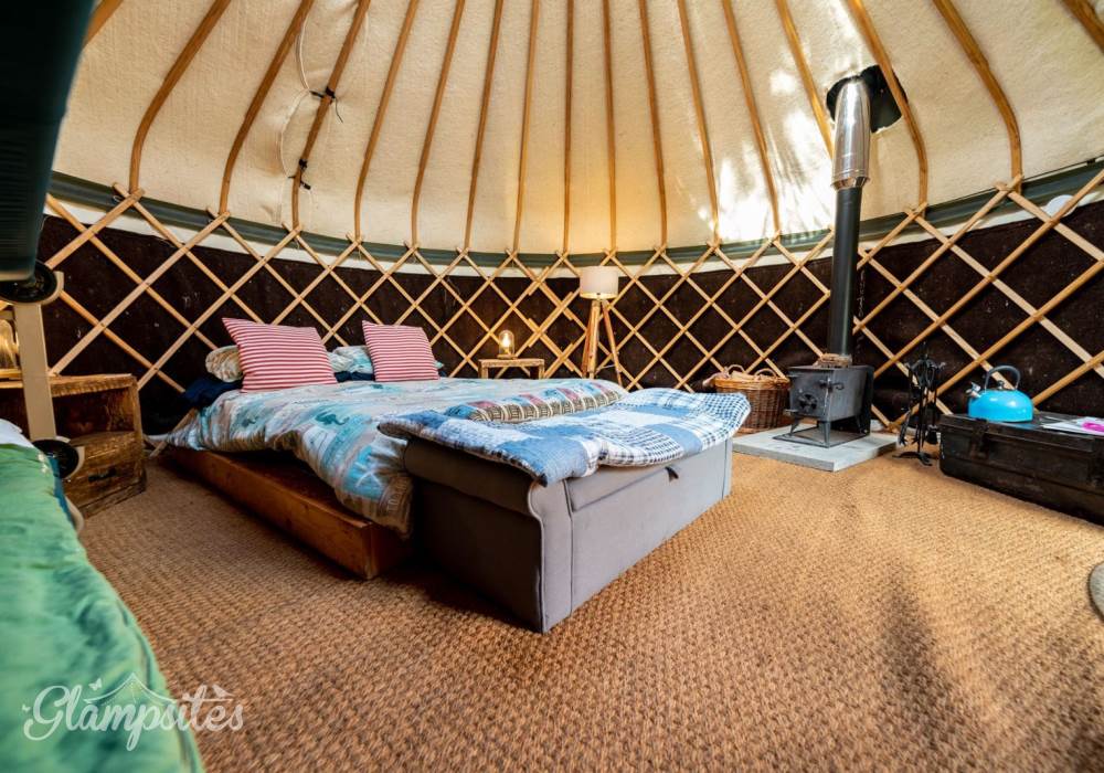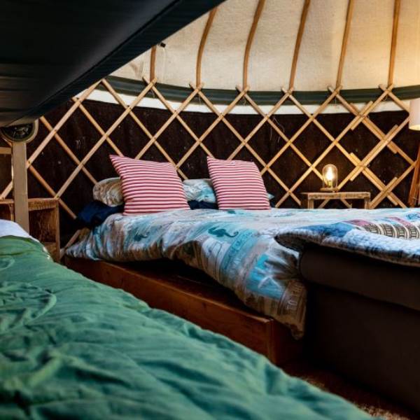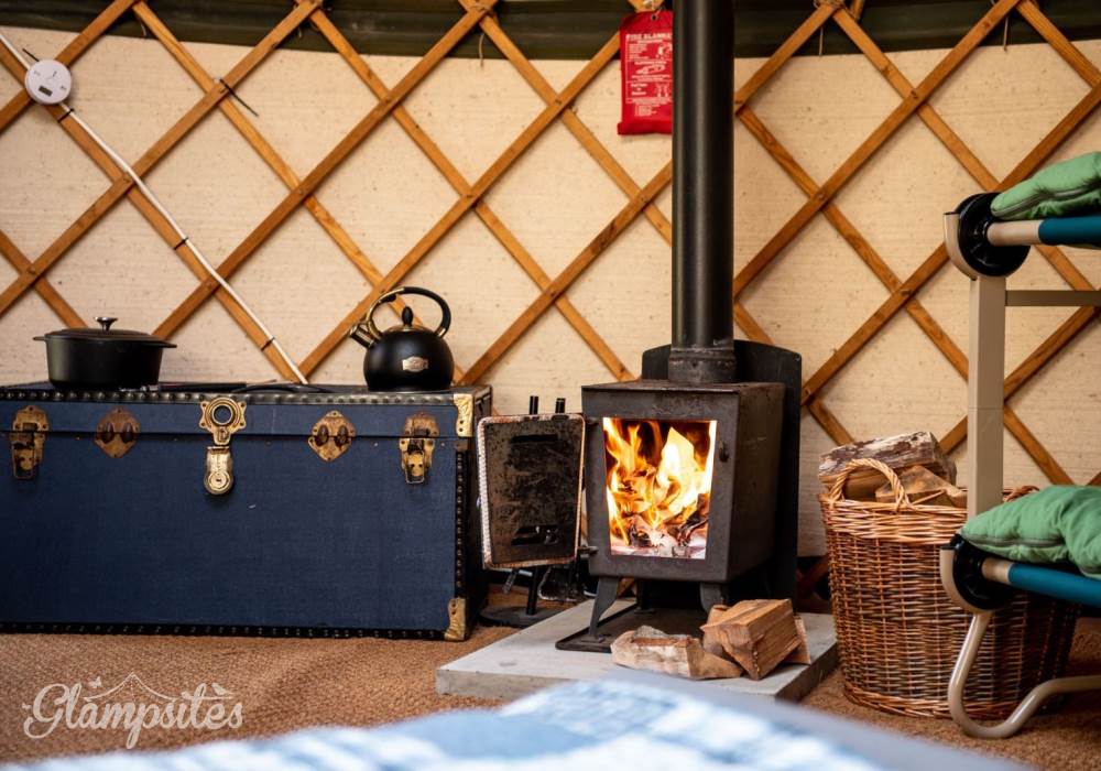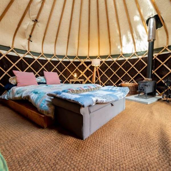 The Mongolian yurts, which have oak doors, are surrounded by a wooden lattice with a window looking up to the stars. Each is fitted with all your creature comforts, guaranteed to make your stay a home-away-from-home. Each yurt has a double bed with a proper mattress and duvet as well as bunk beds, a wood burning stove so you can snuggle up and hunker down, electricity and each has its own undercover cooking and eating area with gas hobs, fridge and its own charcoal BBQ.