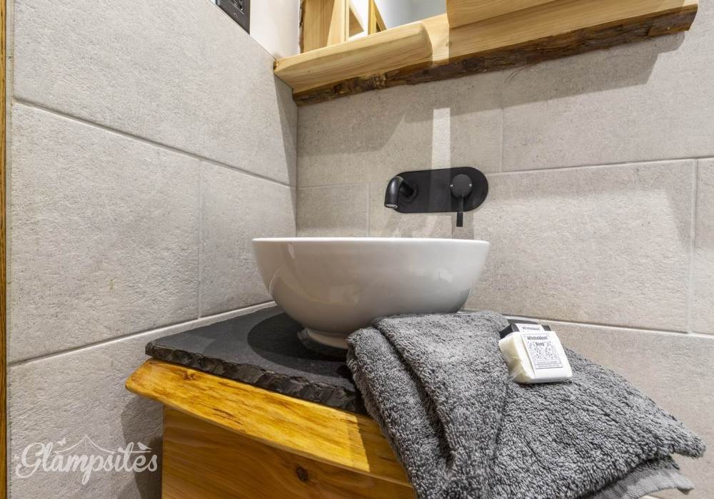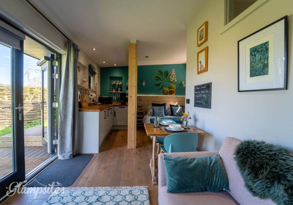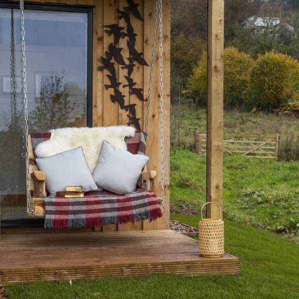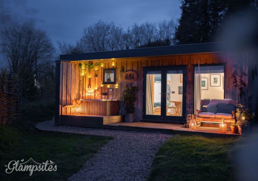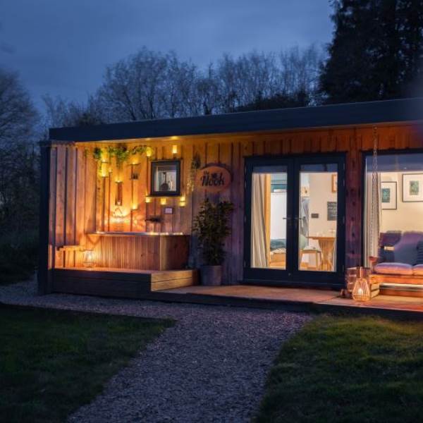 The Nook is a unique, luxury, hand built cedar cabin where everything provided is of the upmost quality and welfare, finished in shades of dusty pink and sage green with furniture hand crafted from recycled scaffold wood.
