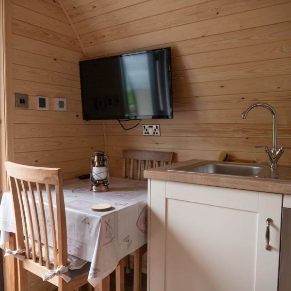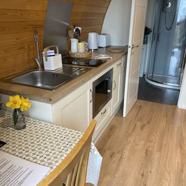 Each of our pods feature a kitchenette area which includes a sink, combi microwave and grill, fridge, kettle and toaster. This pod also comes equipped with all crockery and cutlery for your stay.