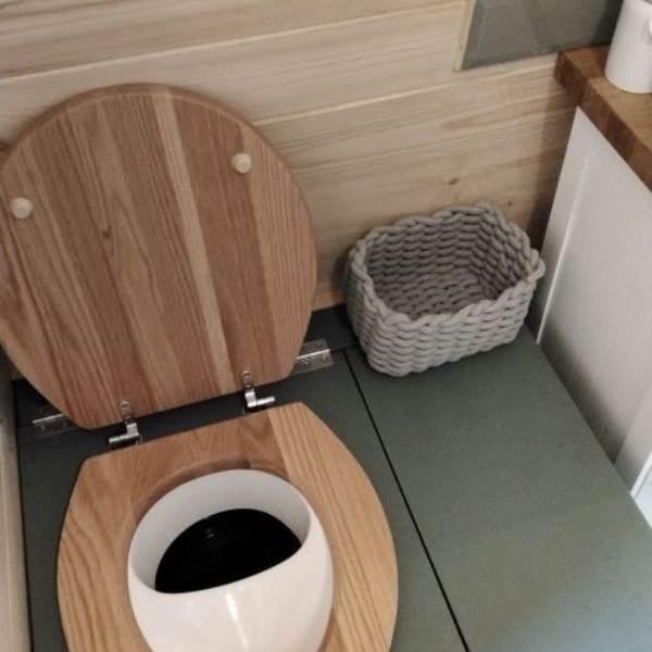 Being "off-grid" all power/lighting is 12v solar, and the toilet is a compost toilet.