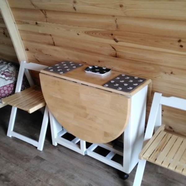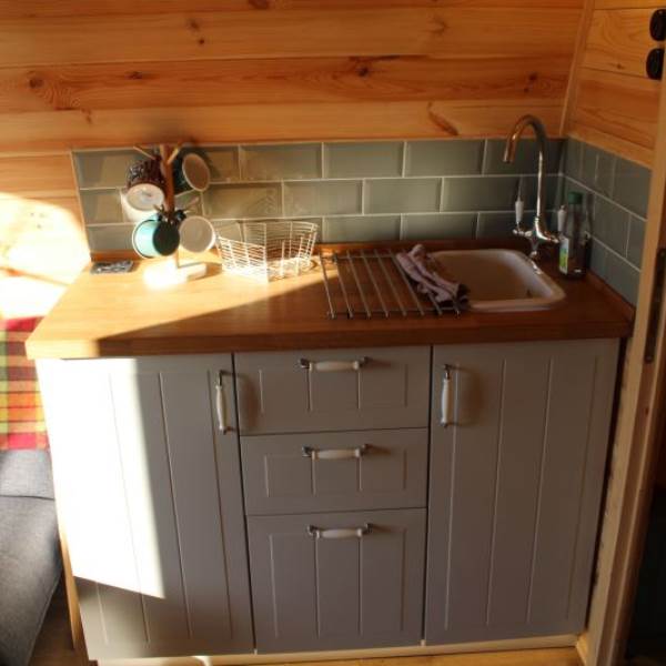 It has a small kitchenette with sink and small fridge, dining table and four chairs, woodburning stove, and an ensuite bathroom with compost toilet, hot shower and handbasin.