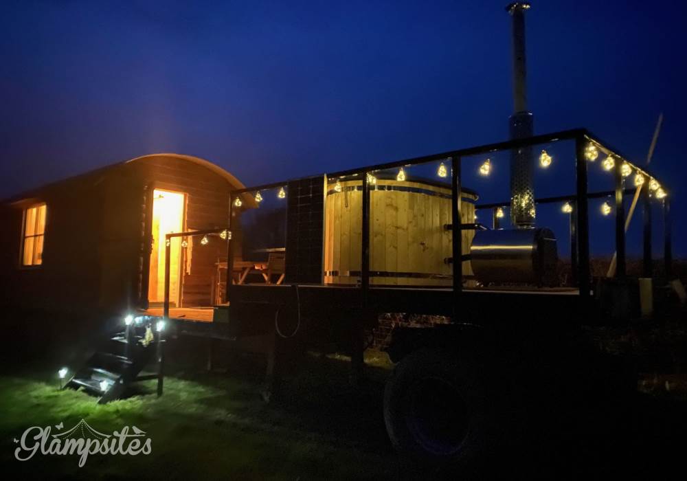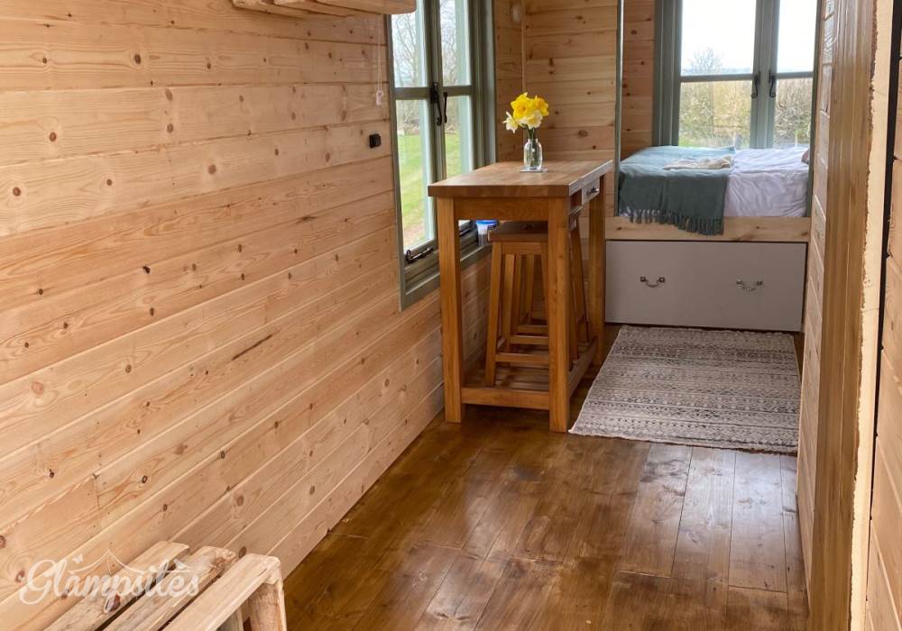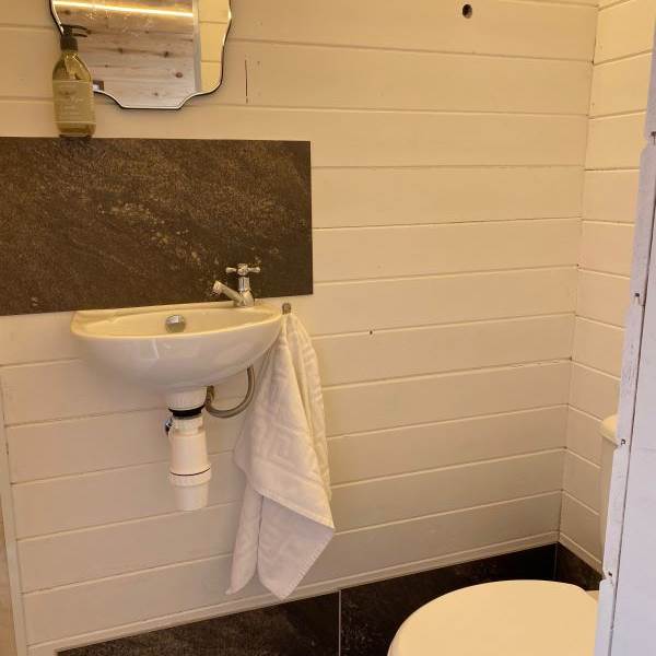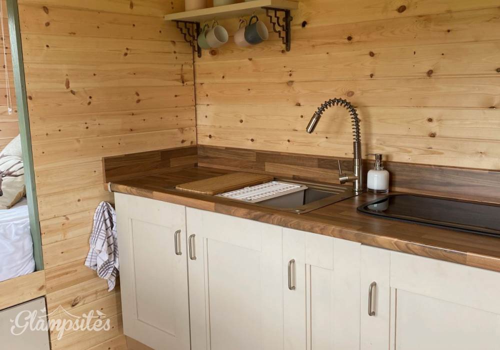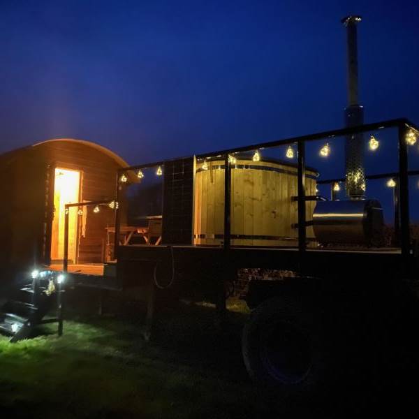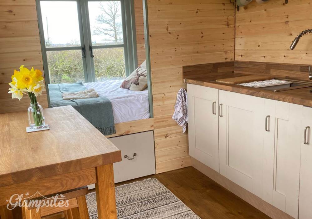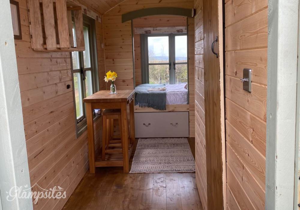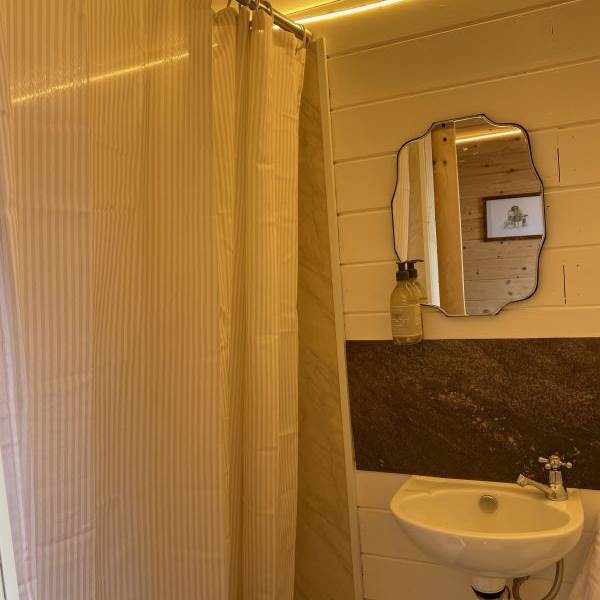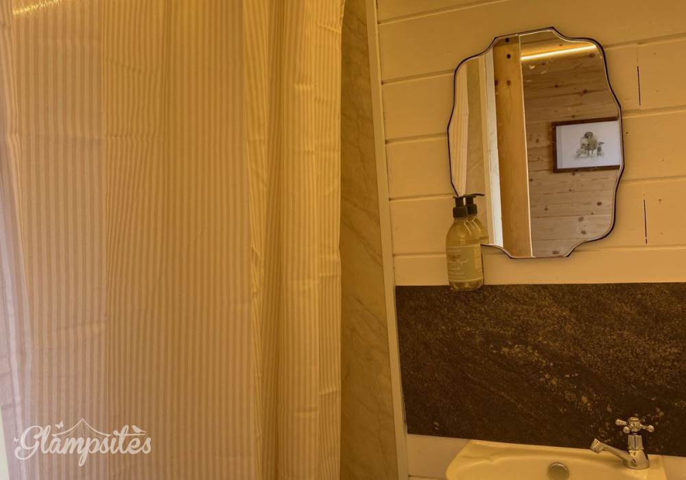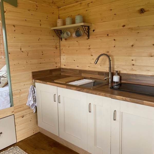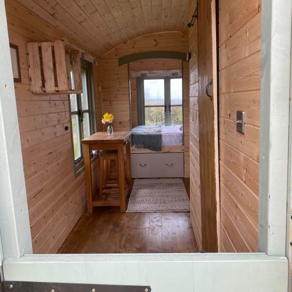 The Shepherd's Lookout is set in its own private field on our farm. The hut is fully furnished. It has a double bed with extra blankets, pillows and hot water bottles. There is an ensuite bathroom with toilet and shower. The kitchen area has a sink, gas stove, cooking utensils and coolbox. There is no electricity however there are lights and USB charging ports powered by a solar battery.