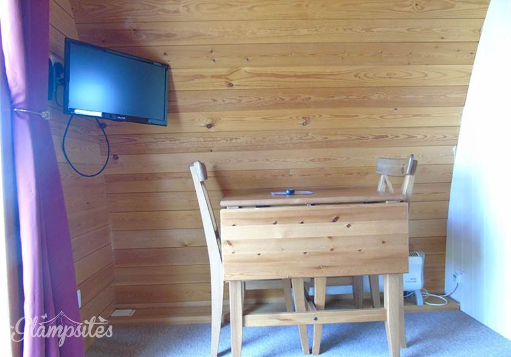 Beautiful location and accommodation in a pod, toilet, 2 beds, microwave, kettle, sink, mini fridge and table and chairs. Only downside was no entertainment during the week when we visited in the school summer holidays.