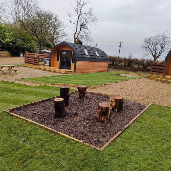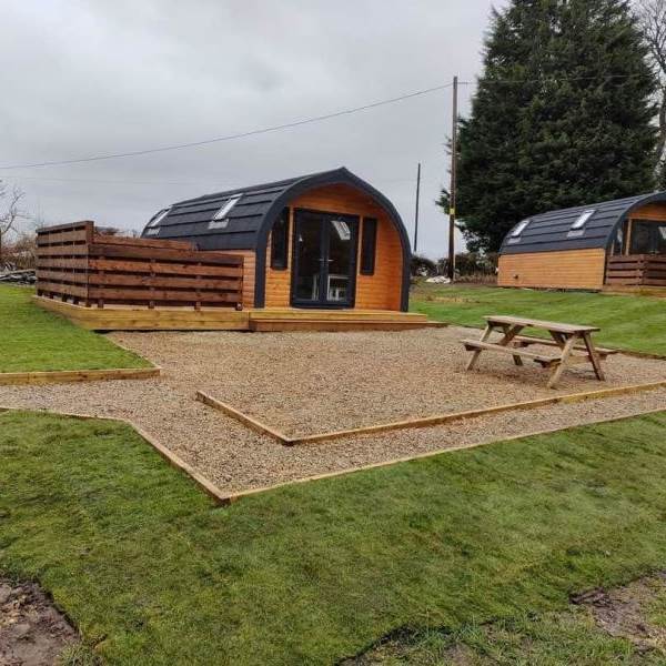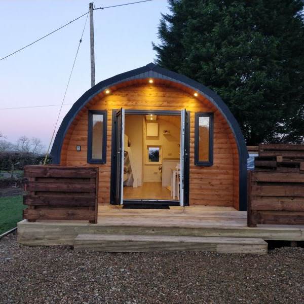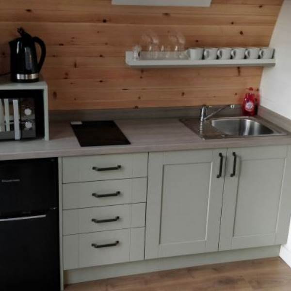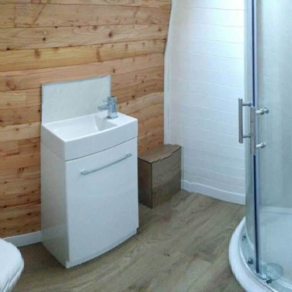 Inside each pod you will find a dining area with table and chairs/benches and a kitchen area equipped with sink, fridge, freezer, kettle, toaster and 2 zone hob. Pots, pans, cutlery and plates are all provided. There is an en-suite with shower, sink and toilet.
