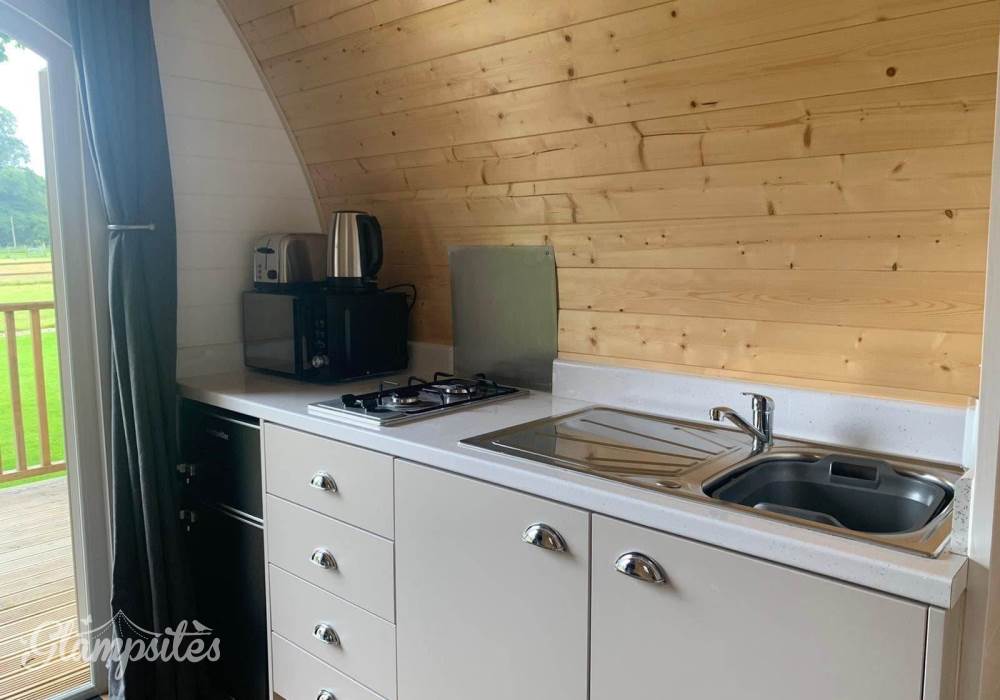 This pod is suitable for 2 adults or 2 adults with 2 children and includes full central heating, a private kitchen with fridge, microwave and toaster and a private ensuite bathroom with toilet and shower.