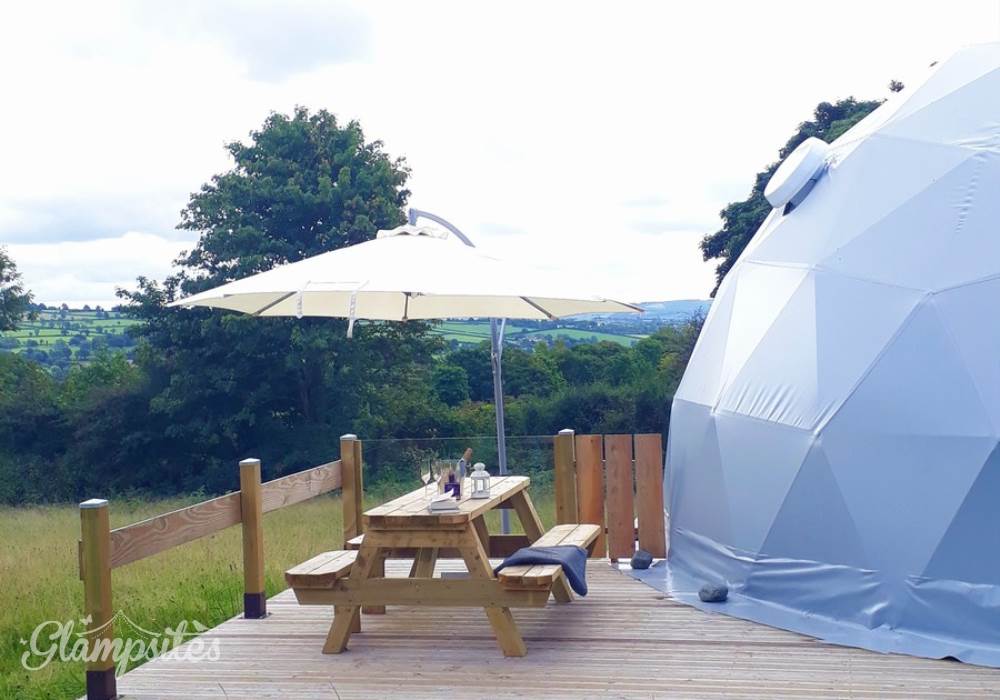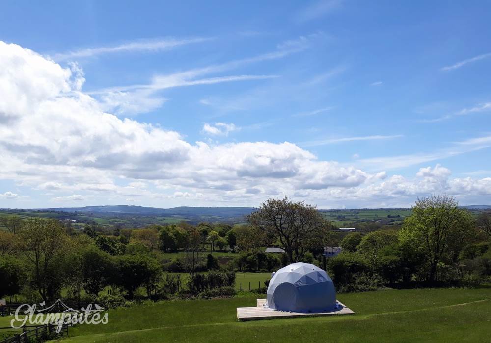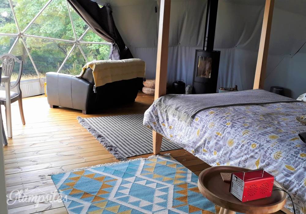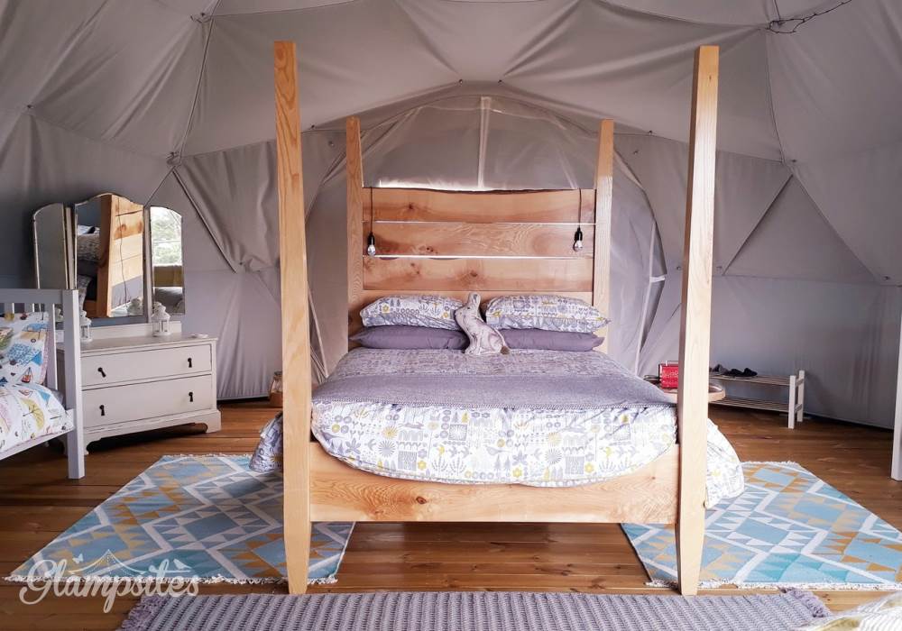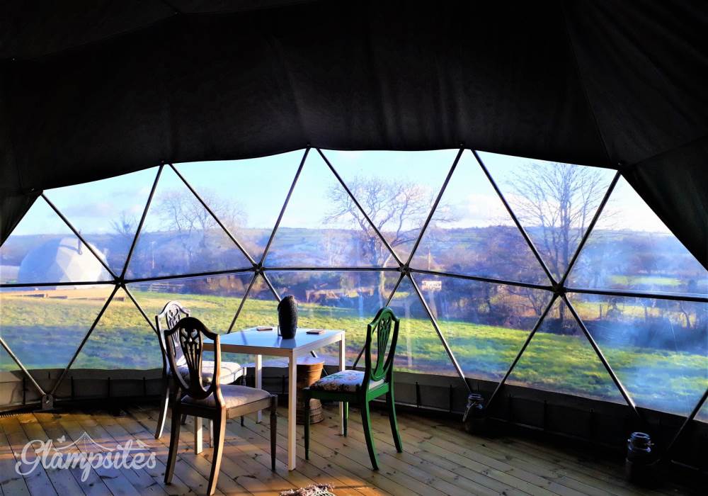 This dome has a cool & quirky meadow-themed décor which reflects the countryside around us. Huge windows across the front merges the outside with the inside: lay in bed with a cup of tea & a book, looking out at the sky & the mountains, lush (as we say in Wales).