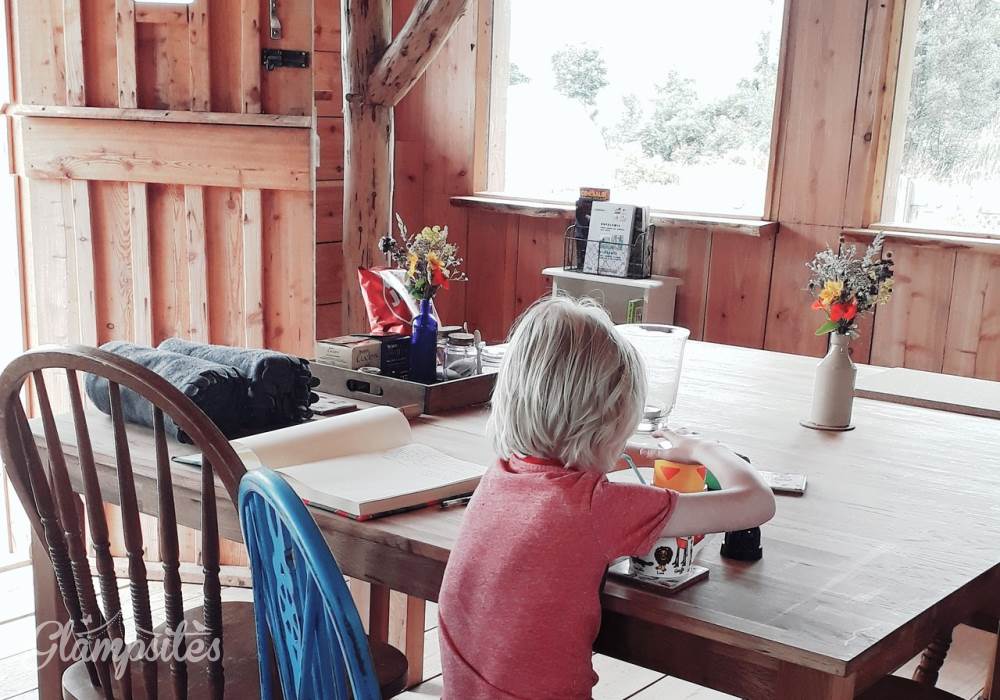 Our beautiful, well-equipped kitchen cabin takes in our views & has space for cooking, eating & relaxing. There's also a sofa, woodburner & lots of indoor & outdoor activities, books & colouring supplies for all ages.