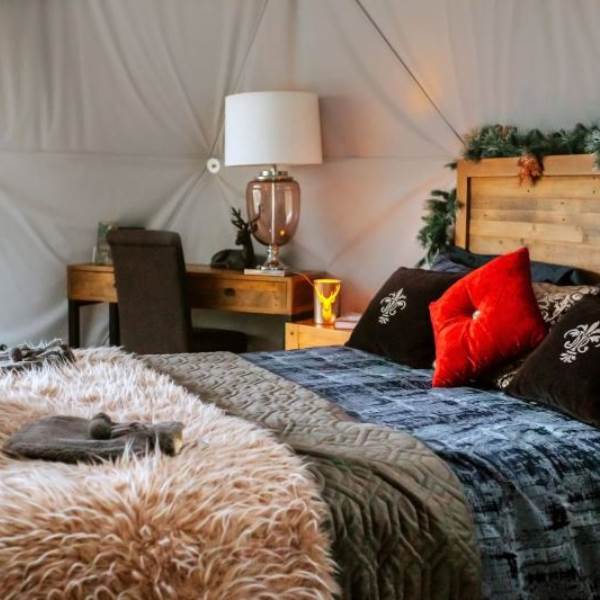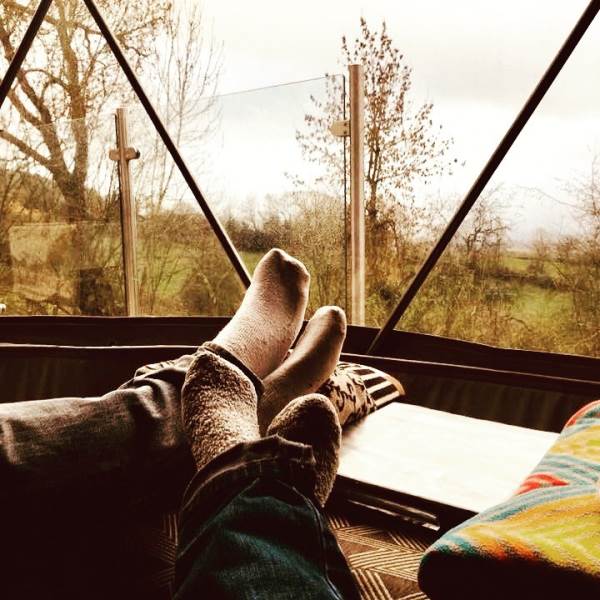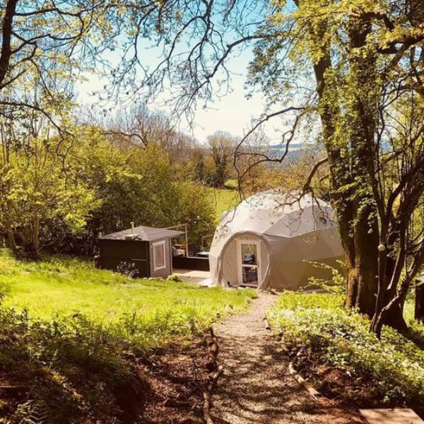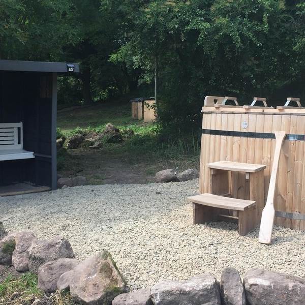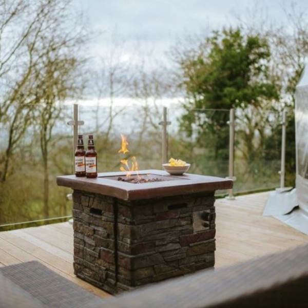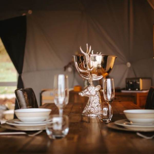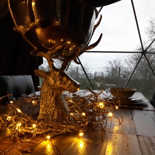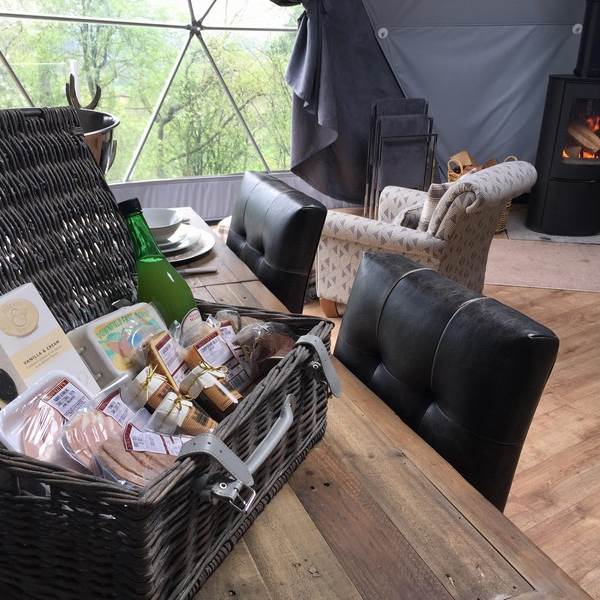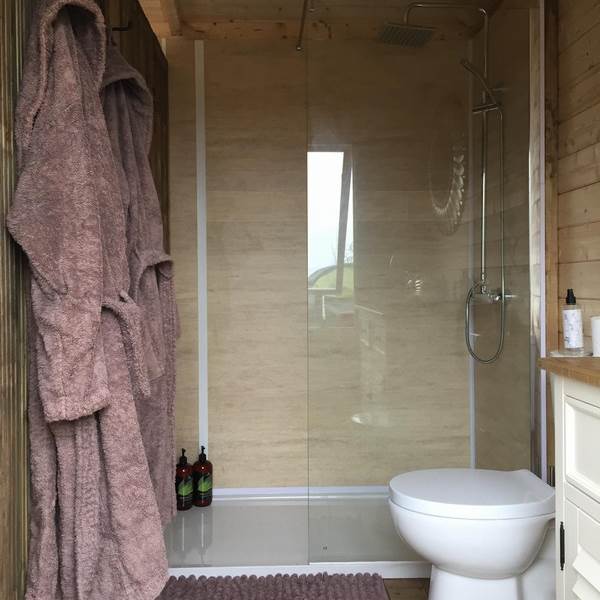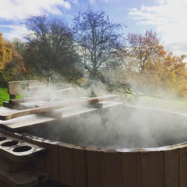 This luxurious glamping accommodation features a king size bed with plush pillows and a luxuriously cosy duvet, a full sized dining table and chairs, outside furniture, a luxurious Scandinavian wood fired hot tub (£65.00 extra charge payable direct), BBQ, and a private bathroom with a steaming hot shower, a flushing toilet and convenient kitchenette. All dogs are welcome at a £25.00 additional charge per dog, payable direct. All dogs must be declared before arrival.